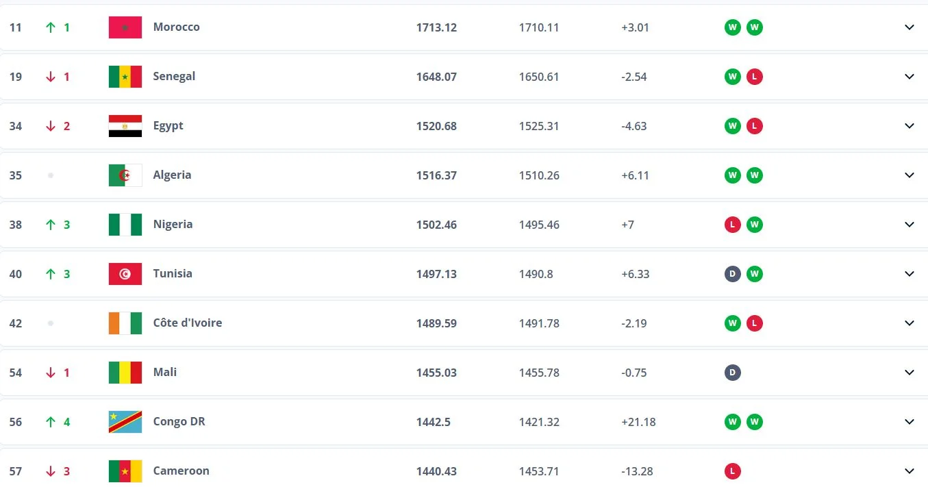 وتواجد منتخب مصر في الترتيب 34 مقابل 32 في آخر تحديث للمنتخبات العالمية، كما تراجع الفراعنة للمركز الثالث قاريًا بعد صدارة المغرب ووصافة السنغال.