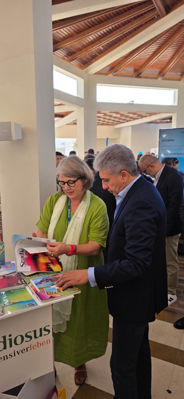 وأجرى وزير السياحة، جولة تفقدية، داخل المعرض المهني المُقام ضمن فعاليات المؤتمر بحضور مدير الاستراتيجية وتطوير الأعمال في مجموعة رايفايزن تورستيك (RTG)، والرئيس التنفيذي للرابطة؛ حيث تفقد أجنحة العارضين البالغ عددهم 50 عارضًا، كما التقى بعدد من ممثلي الشركات المشاركة، واستمع إلى خططهم المستقبلية ورؤيتهم لتعزيز التعاون مع السوق المصرية، إلى جانب مقترحاتهم لجذب المزيد من السائحين الألمان إلى المقصد المصري.