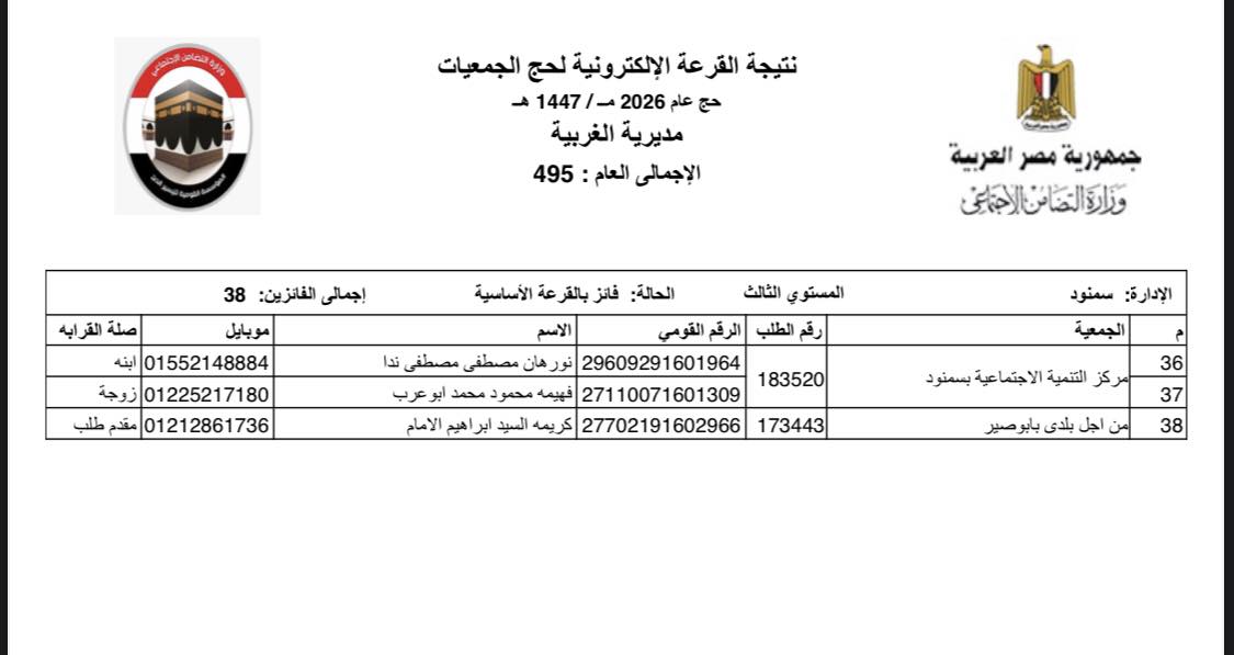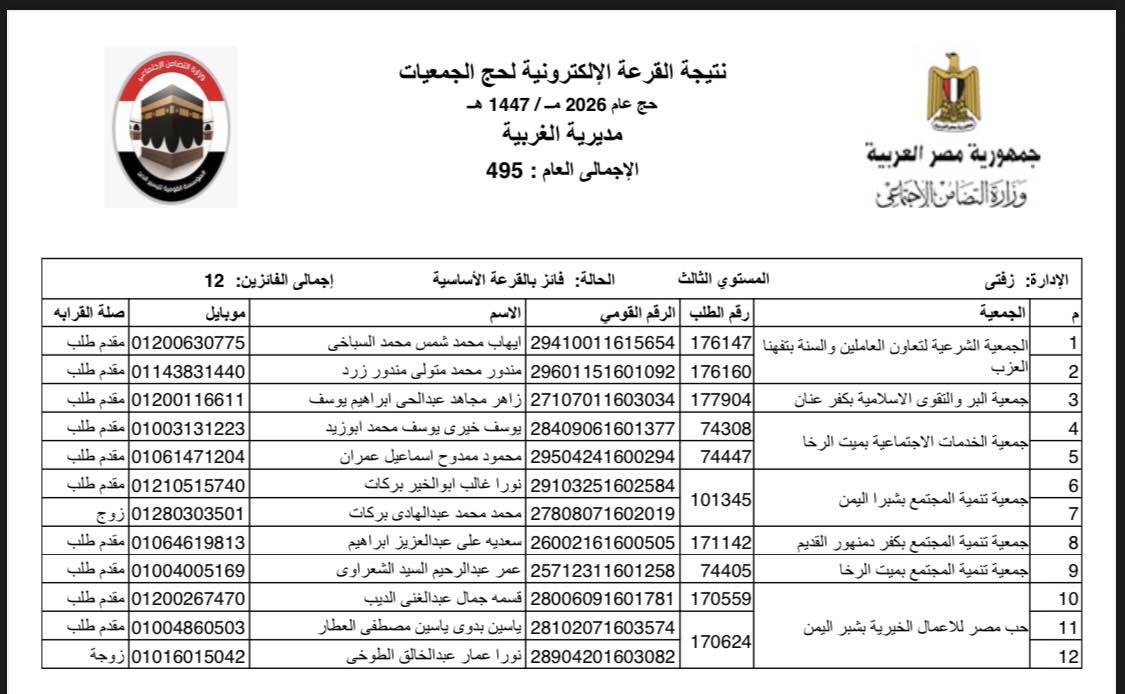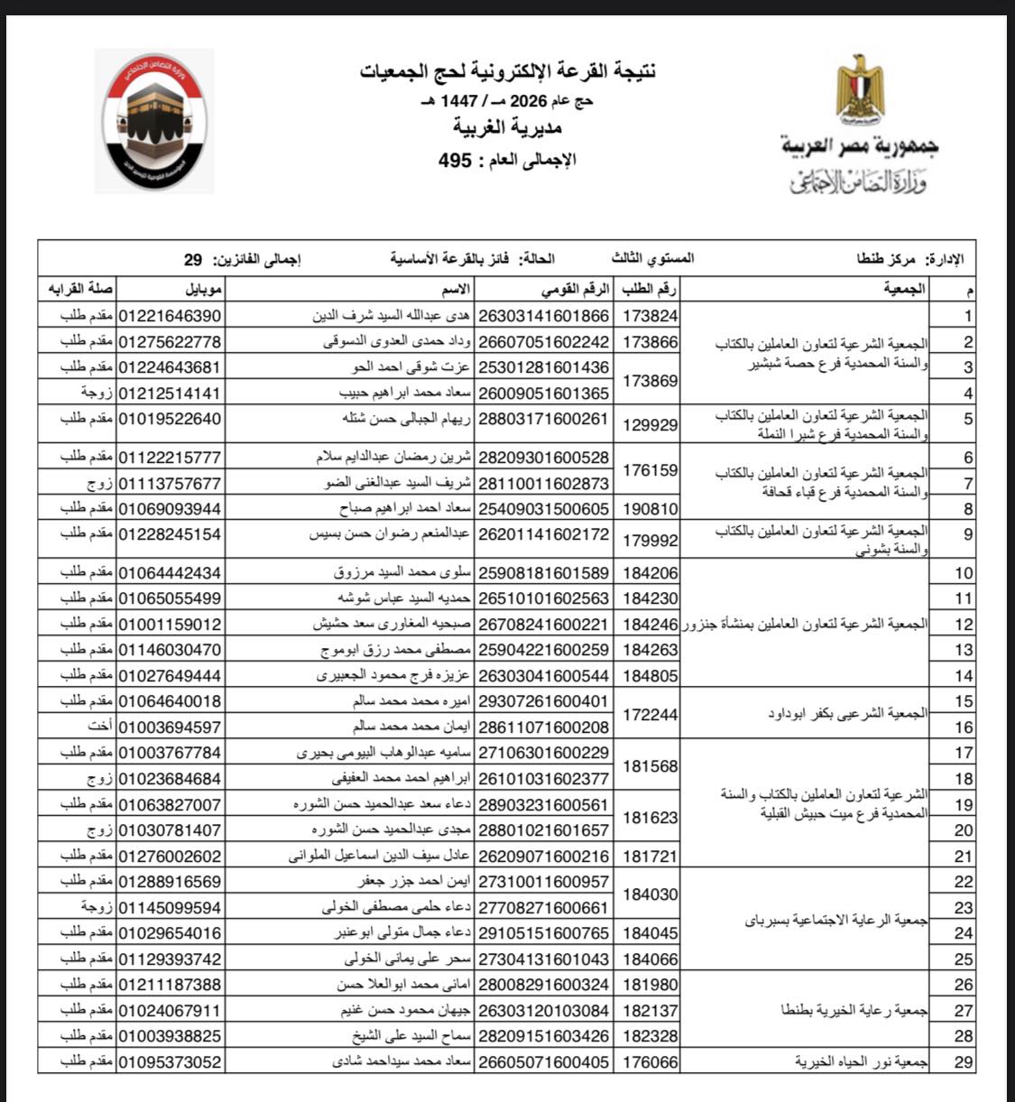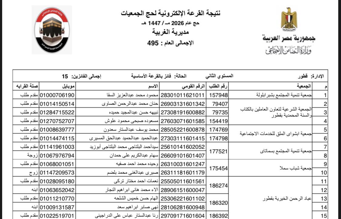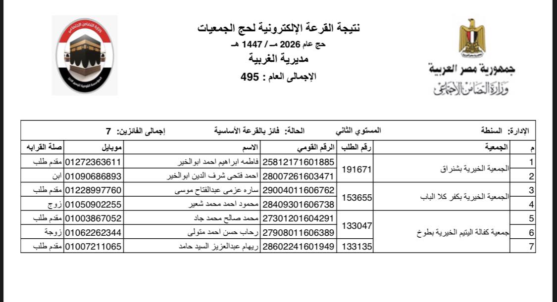 رسميَا.. ننشر أسماء الفائزين في القرعة الإلكترونية لحج الجمعيات الأهلية بمحافظة الغربية