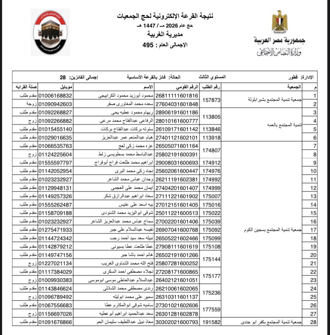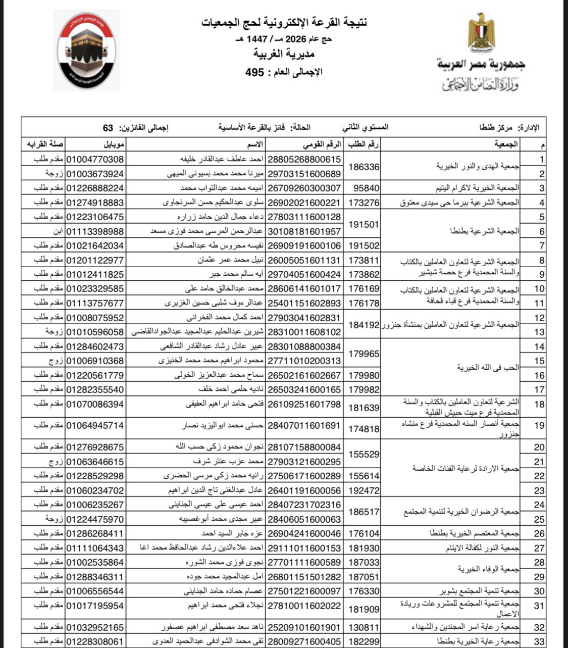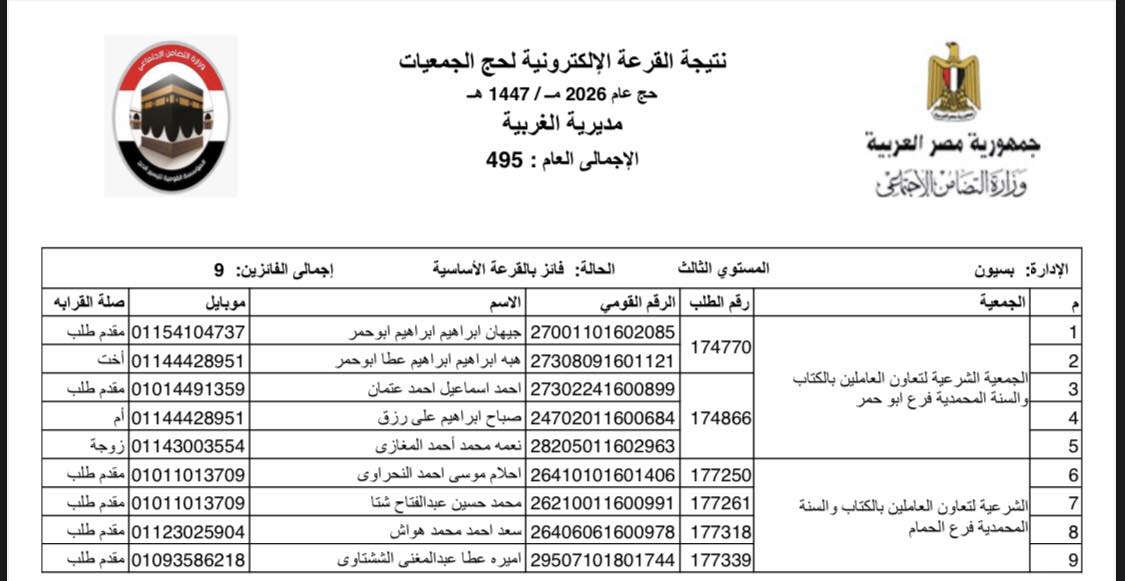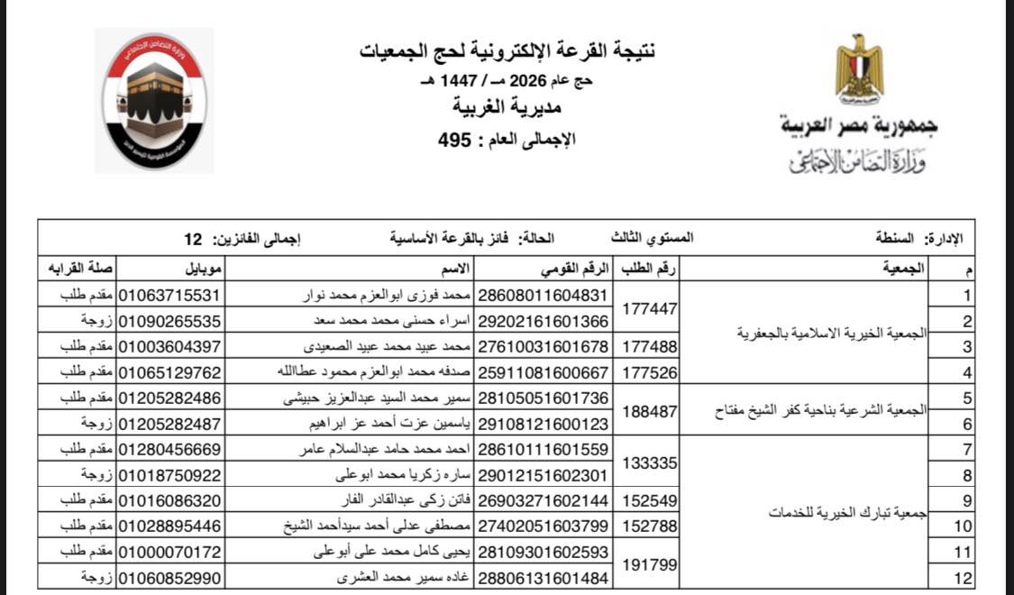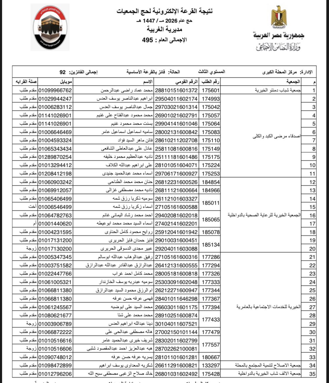 رسميَا.. ننشر أسماء الفائزين في القرعة الإلكترونية لحج الجمعيات الأهلية بمحافظة الغربية