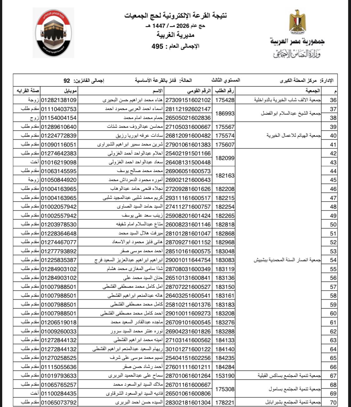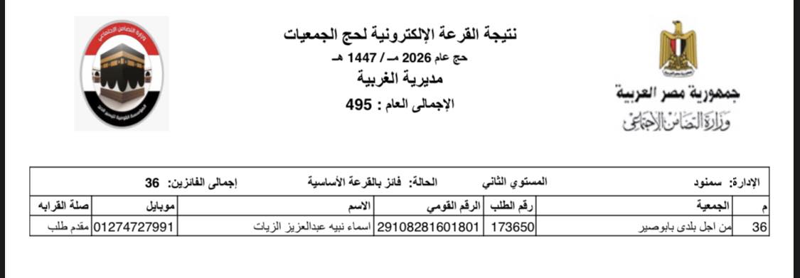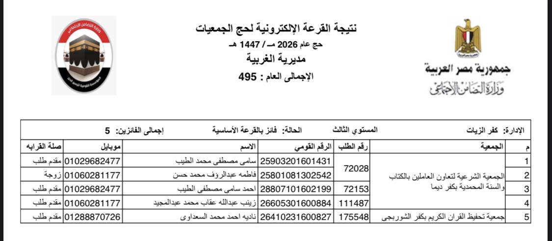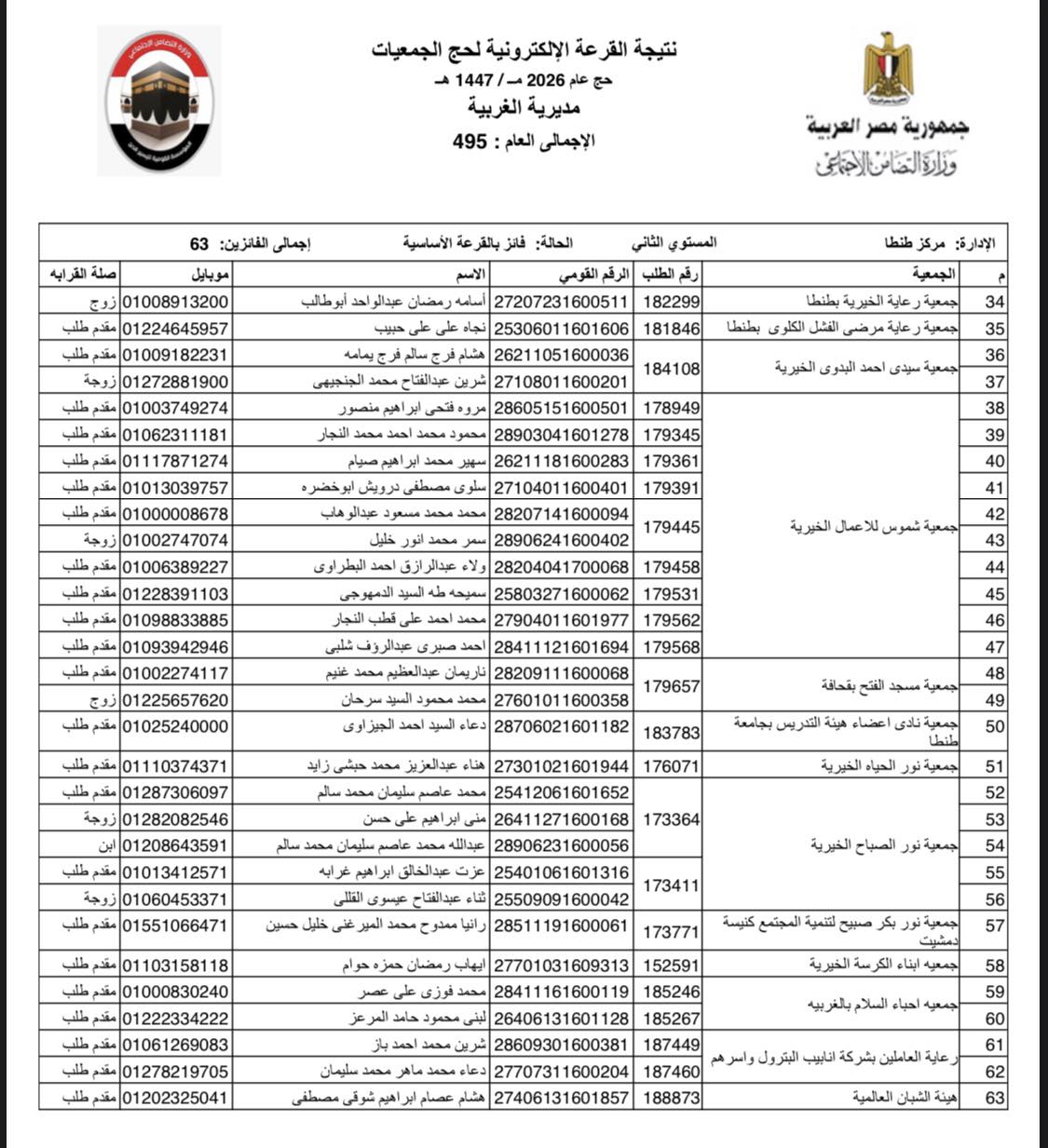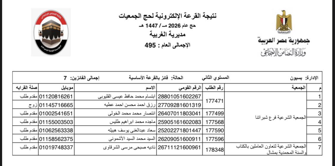 رسميَا.. ننشر أسماء الفائزين في القرعة الإلكترونية لحج الجمعيات الأهلية بمحافظة الغربية
