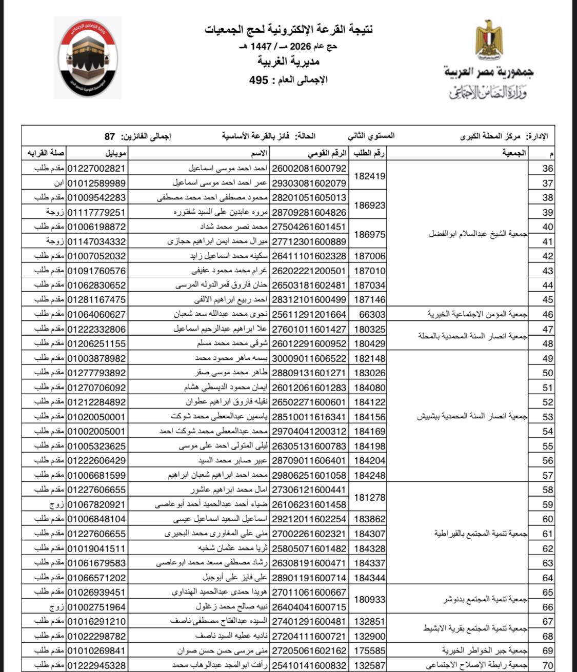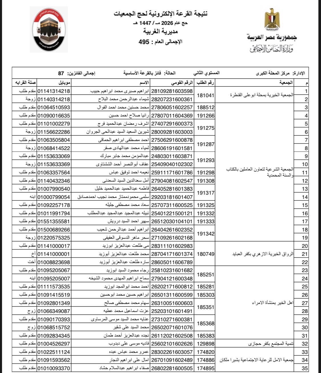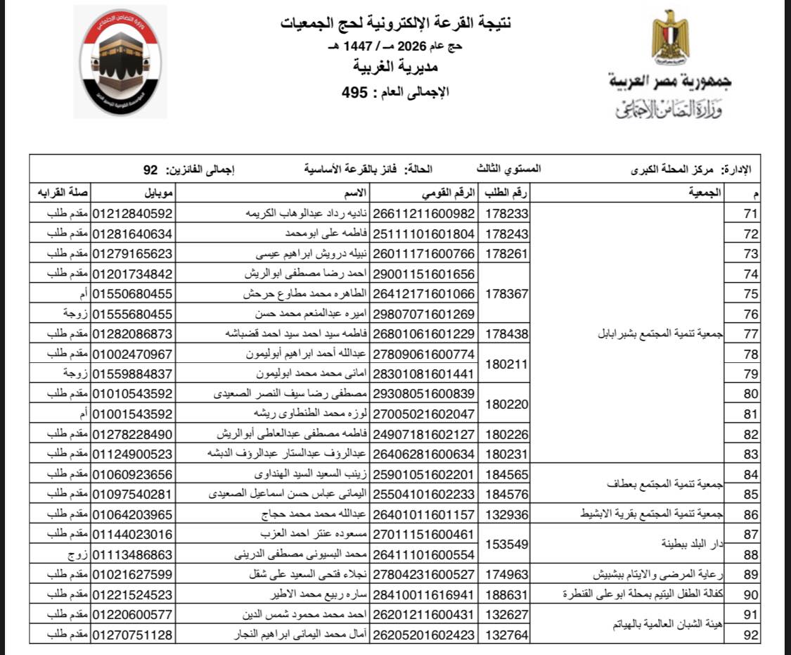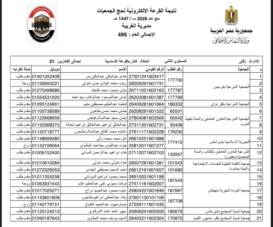 أسماء الفائزين في قرعة حج الجمعيات الأهلية بالغربية