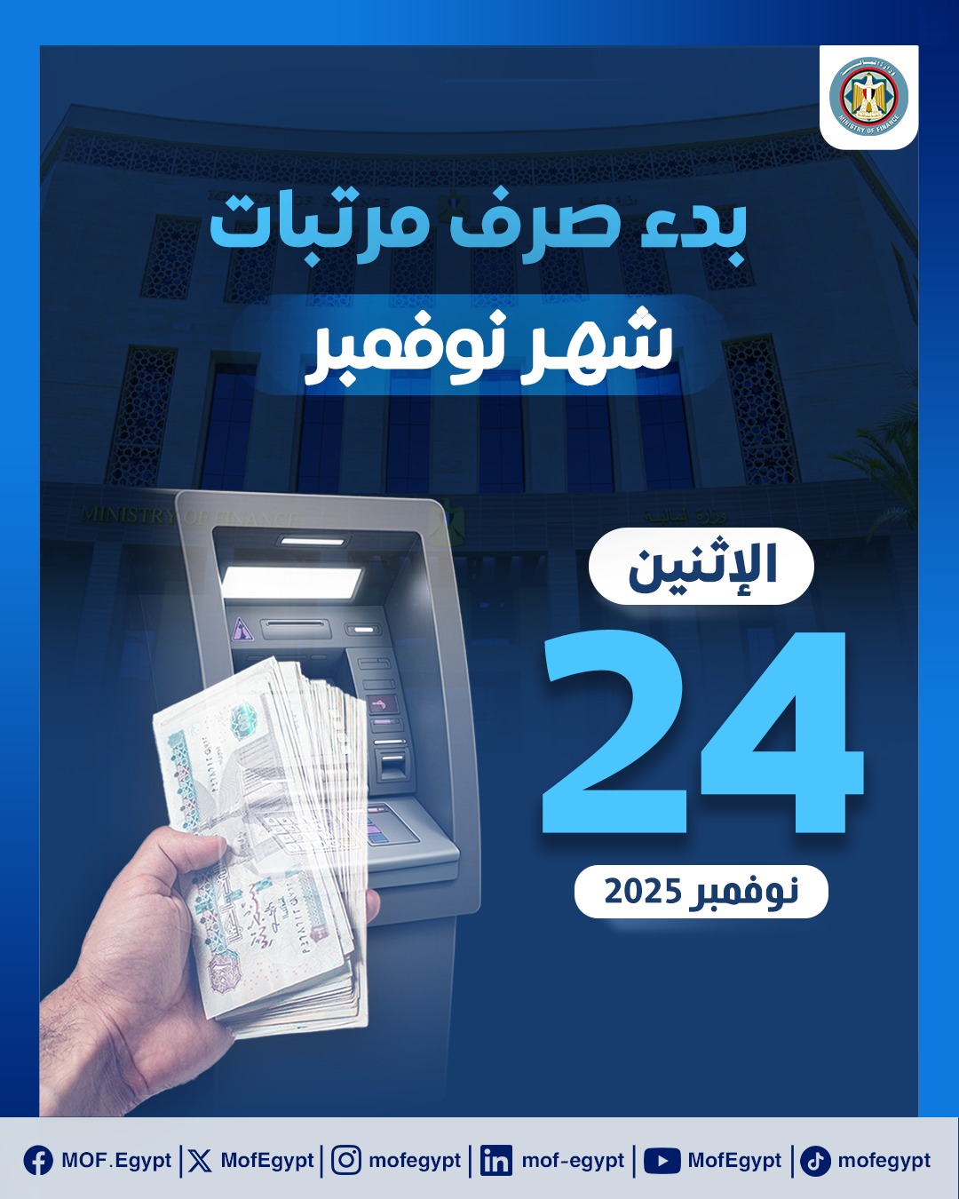 أعلنت وزارة المالية رسميًا عن موعد بدء صرف مرتبات شهر نوفمبر للموظفين العاملين بالدولة.