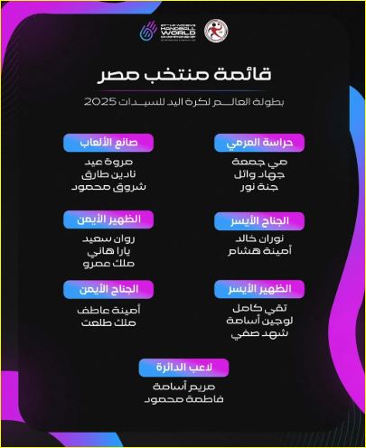 أعلن اتحاد كرة اليد برئاسة خالد فتحي قائمة منتخب مصر في بطولة العالم للسيدات في نسختها الـ27، والمقرر إقامتها فى هولندا وألمانيا خلال الفترة من 26 نوفمبر إلى 14 ديسمبر 2025.