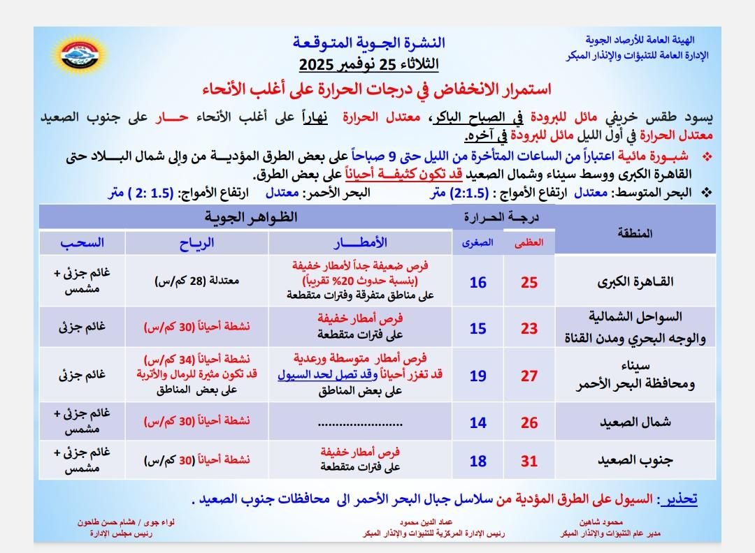 كشفت الهيئة العامة للأرصاد الجوية عن توقعاتها لحالة الطقس خلال الساعات القادمة من صباح اليوم الثلاثاء الموافق 25 نوفمبر 2025.