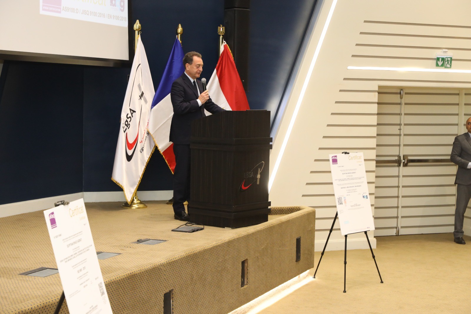 وجاءت هذه الفعالية لتجسد اهتمام الدولة المصرية بتطوير البنية الفضائية الوطنية، وتعميق الشراكات الدولية، وإبراز الدور الإقليمي للوكالة على مستوى القارة الإفريقية. وقد شهد الحفل حضورًا رفيعا تقدمه الدكتور مهندس ماجد إسماعيل الرئيس التنفيذي لوكالة الفضاء المصرية، وإريك شوفالييه السفير الفرنسي بالقاهرة، والدكتور شريف صدقي الرئيس التنفيذي السابق للوكالة، والدكتور تيديان أوتارا رئيس مجلس الفضاء الإفريقي، واللواء شريف الرشيدي رئيس قطاع شئون الصناعة بوزارة الصناعة، إلى جانب ممثل شركة AFNOR الفرنسية المانحة لشهادات الاعتماد.