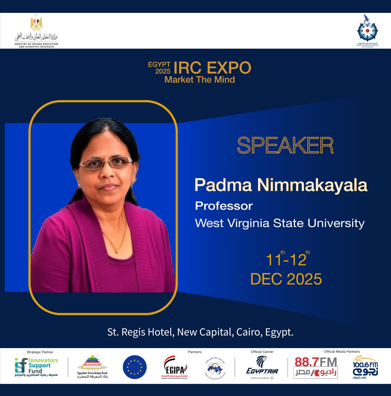 ومن الولايات المتحدة، تنضم البروفيسور Padma Nimmakayala من جامعة ويست فيرجينيا، وهي باحثة وأستاذة مرموقة في العلوم الزراعية والبيولوجية، وتُعرف بإسهاماتها الأكاديمية ودعمها المستمر لمسارات البحث العلمي داخل الجامعات. وتشارك في جلسة نقاشية حول دور الجامعات في تعزيز الابتكار بعنوان The Third Mission Revolution: Universities as Innovation Catalysts.