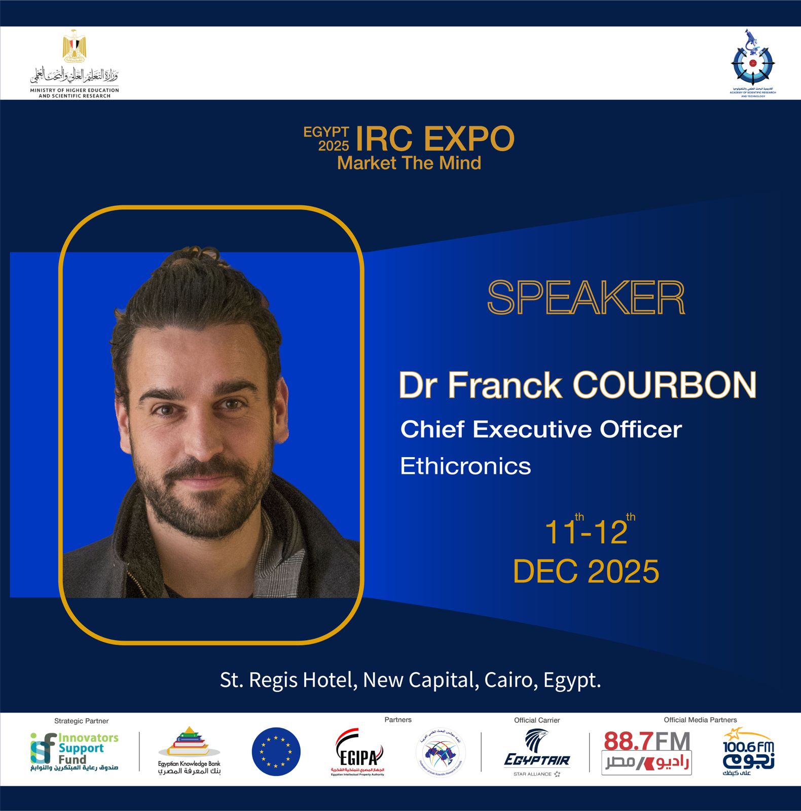 وينضم إلى قائمة المتحدثين د. Franck Courbon، الرئيس التنفيذي لشركة Ethicronics وأحد أبرز المؤثرين في مجال الـ Deep-Tech والأمن السيبراني في المملكة المتحدة. بعد سبع سنوات من البحث بجامعة كامبريدج وجمع مليون جنيه إسترليني لتمويل مشروعاته، يقود كوربون فريقًا عالميًا يعمل على ابتكار حلول تكنولوجية عابرة للحدود، وسيقدّم ورشة عمل متخصصة بعنوان Cross-Border Technology Transfer Mechanisms.