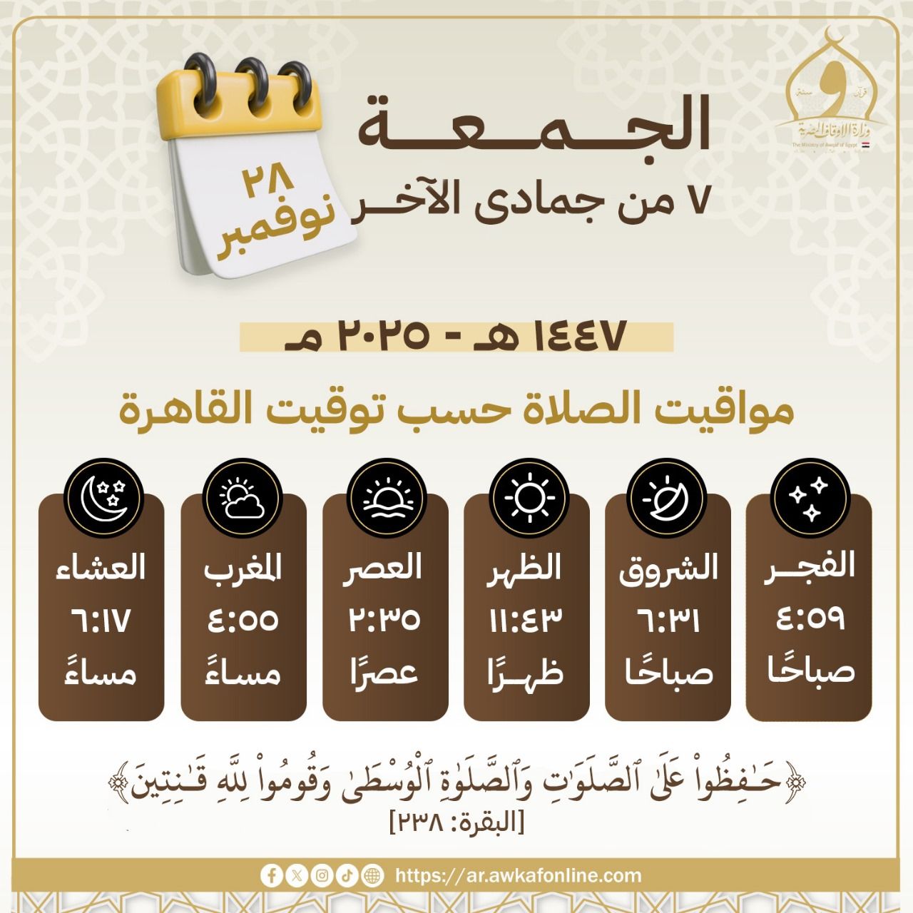 مواقيت الصلاة اليوم الجمعة 28 نوفمبر 2025.. «اعرف موعد صلاة الظهر»