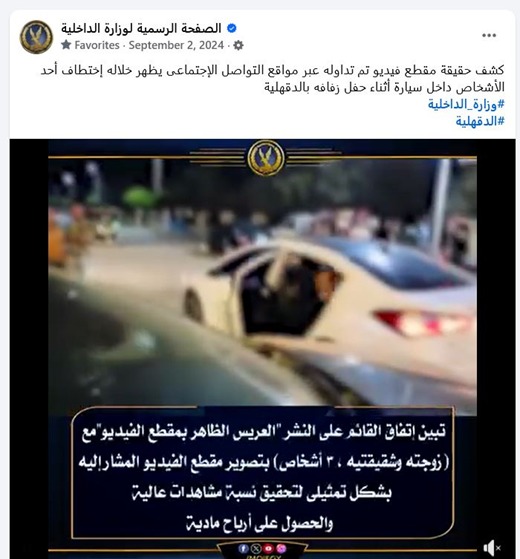 كشفت الأجهزة الأمنية بوزارة الداخلية ملابسات مقطع فيديو تم تداوله على إحدى الصفحات بمواقع التواصل الاجتماعي يظهر خلاله اختطاف أحد الأشخاص أثناء حفل زفافه بالدقهلية.