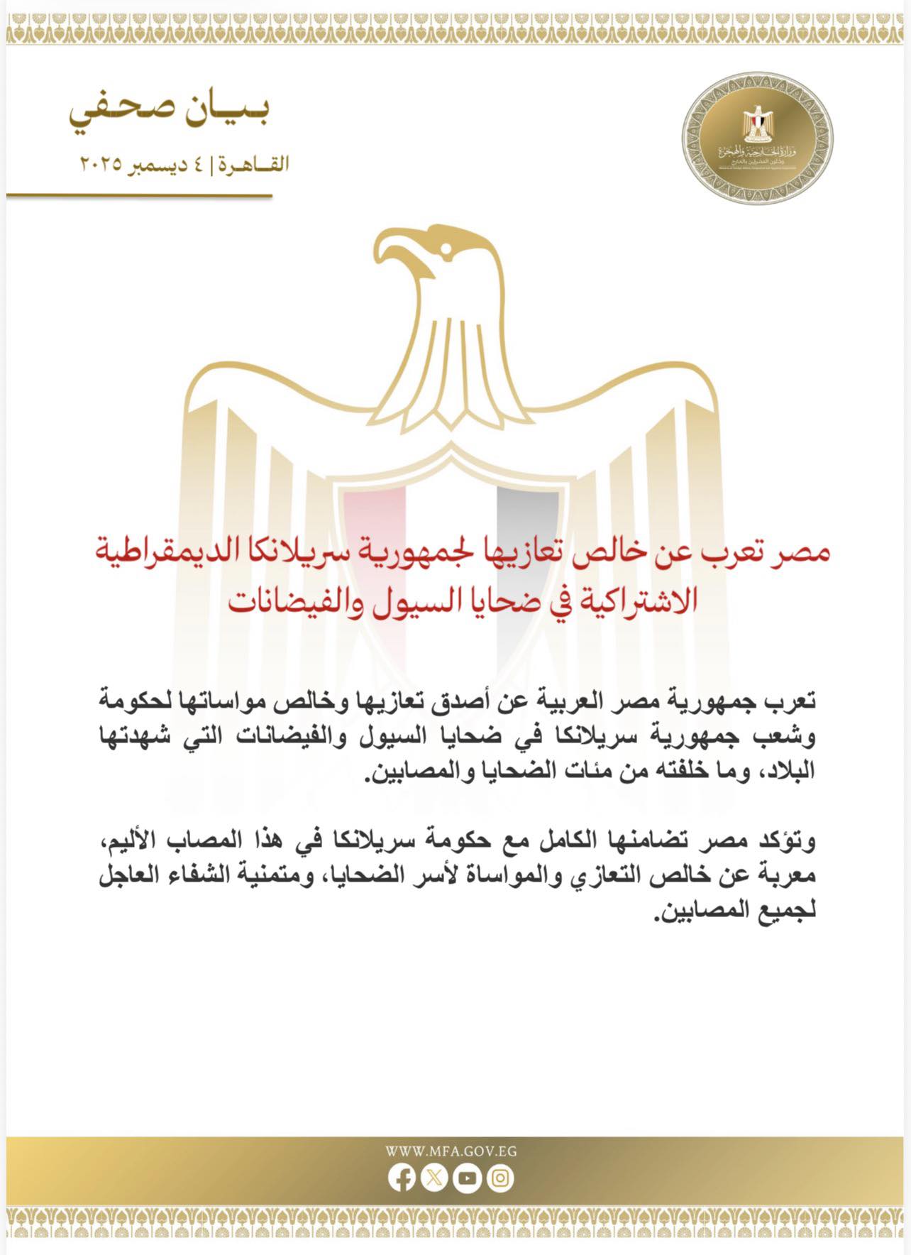 أصدرت وزارة الخارجية بياناً أعربت فيه عن أصدق تعازي جمهورية مصر العربية وخالص مواساتها لحكومة وشعب جمهورية سريلانكا الصديقة في ضحايا السيول والفيضانات التي شهدتها البلاد، وما خلفته من مئات الضحايا والمصابين.