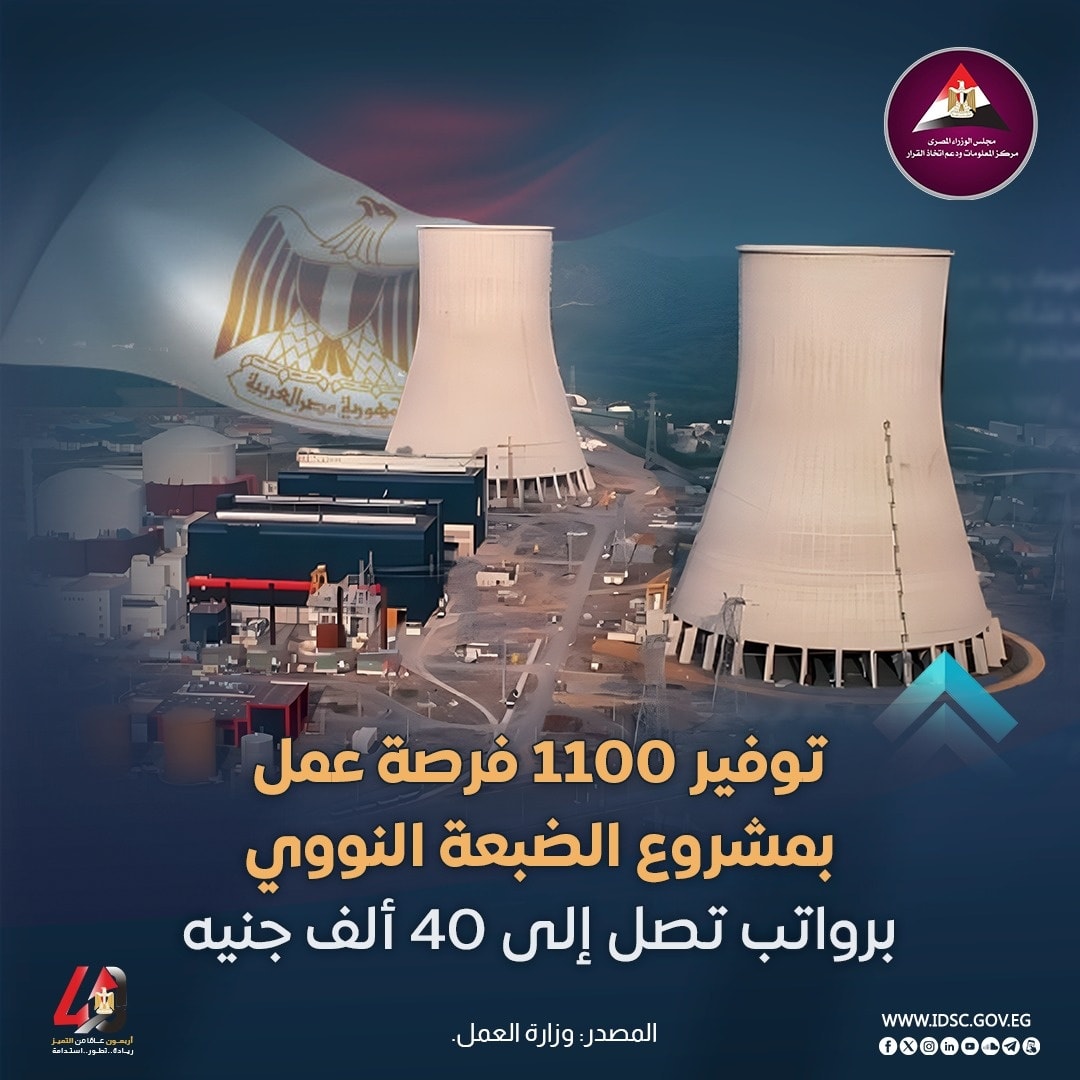 وحسب وزارة العمل، تم توفير 1100 فرصة عمل فنية جديدة داخل مشروع محطة الضبعة النووية، وفقًا لمركز المعلومات ودعم اتخاذ القرار، وتشمل: