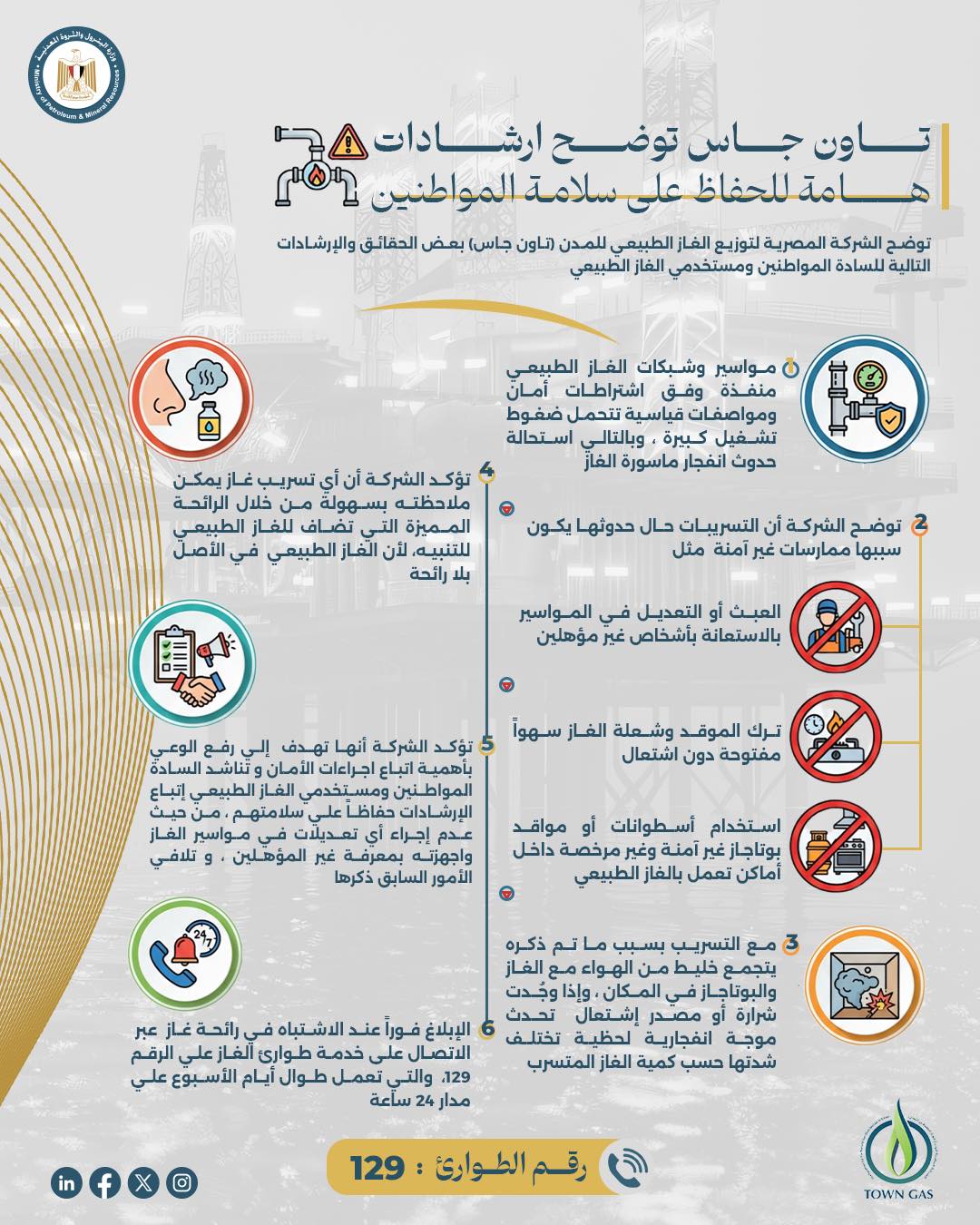 5- تؤكد الشركة أنها تهدف لرفع الوعي بأهمية اتباع إجراءات الأمان، وتناشد المواطنين ومستخدمي الغاز الطبيعي اتباع الإرشادات؛ حفاظًا على سلامتهم، من حيث عدم إجراء أي تعديلات في مواسير الغاز وأجهزته بمعرفة غير المؤهلين، وتلافي الأمور السابق ذكرها.