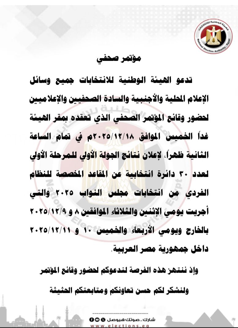تعلن الهيئة الوطنية للانتخابات برئاسة القاضي حازم بدوي نائب رئيس محكمة النقض، غدا الخميس، النتيجة الرسمية لانتخابات الـ30 دائرة الملغاة بأحكام قضائية من المرحلة الأولى لانتخابات مجلس النواب 2025، التي أجريت فيها التصويت يومي 10 و11 ديسمبر بالداخل.