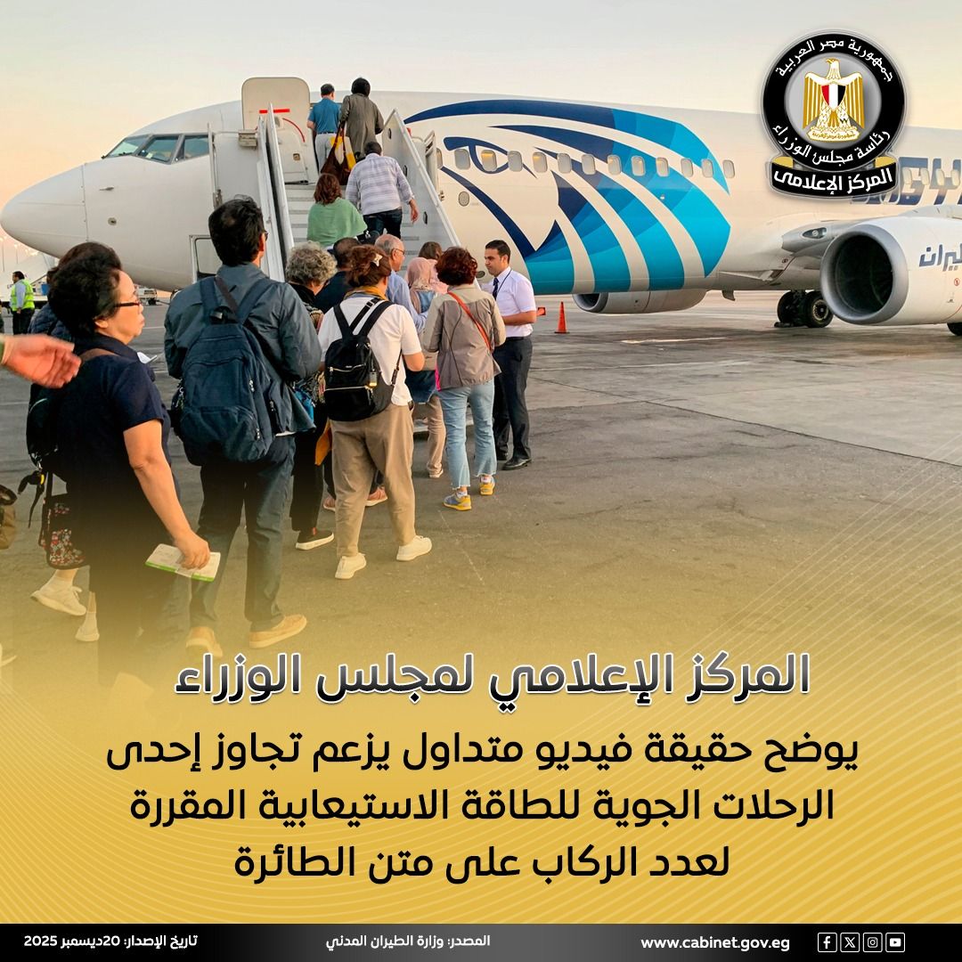 كشف المركز الإعلامي لمجلس الوزراء، حقيقة مقطع فيديو متداول على مواقع التواصل الاجتماعي يزعم تجاوز إحدى الرحلات الجوية للطاقة الاستيعابية المقررة لعدد الركاب على متن الطائرة.