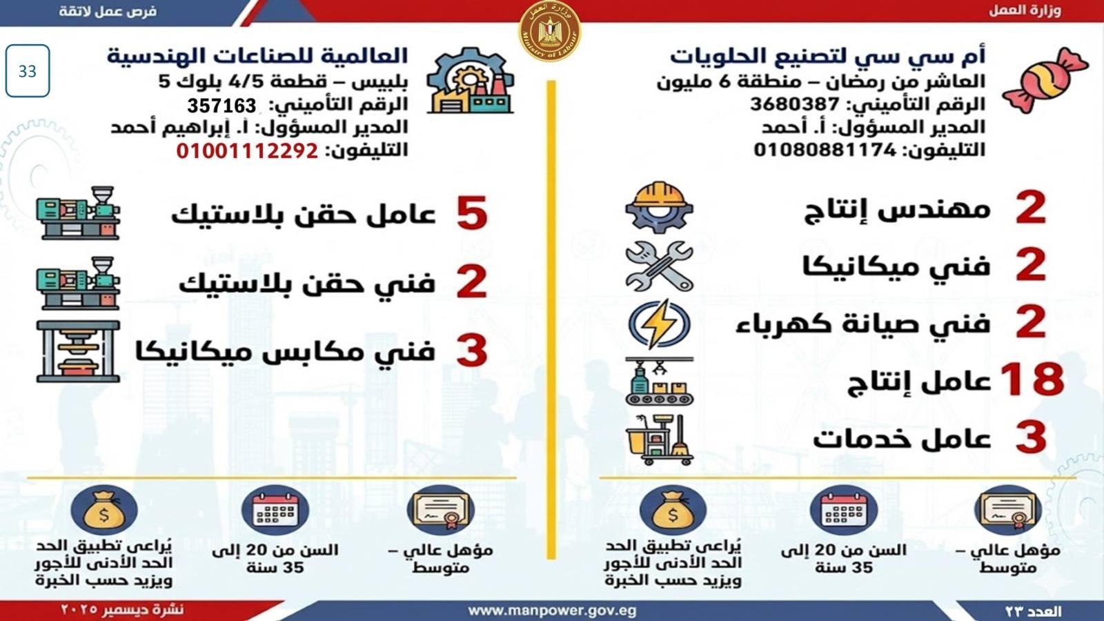 وبيّنت الوزارة أن التقديم على هذه الفرص يتم خلال شهر ديسمبر 2025، من خلال الإدارة العامة للتشغيل بمقر الوزارة القديم بمدينة نصر، أو عبر مديريات العمل بالمحافظات.