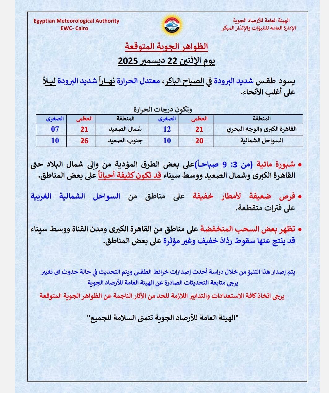 تتوقع الهيئة العامة للأرصاد الجوية، أن يشهد غدًا الإثنين 22- 12- 2025، انخفاضًا في درجات الحرارة في الصباح الباكر وخلال فترات الليل على أغلب الأنحاء، ليسود طقس شديد البرودة في الصباح الباكر، معتدل الحرارة نهاراً شديد البرودة ليلاً.
