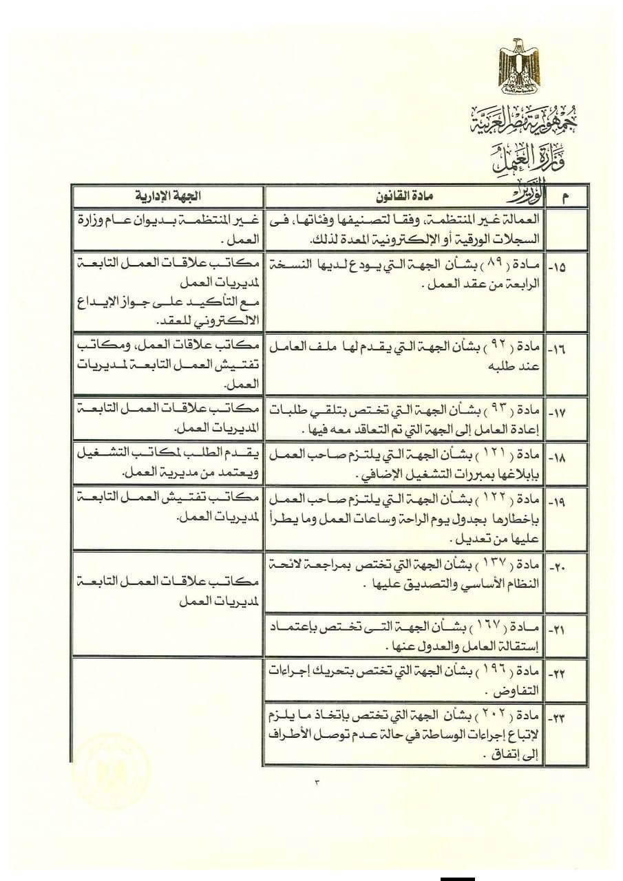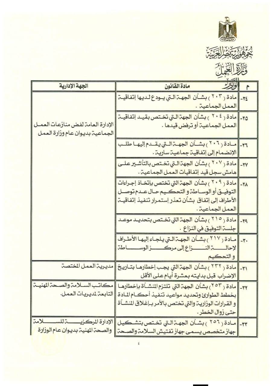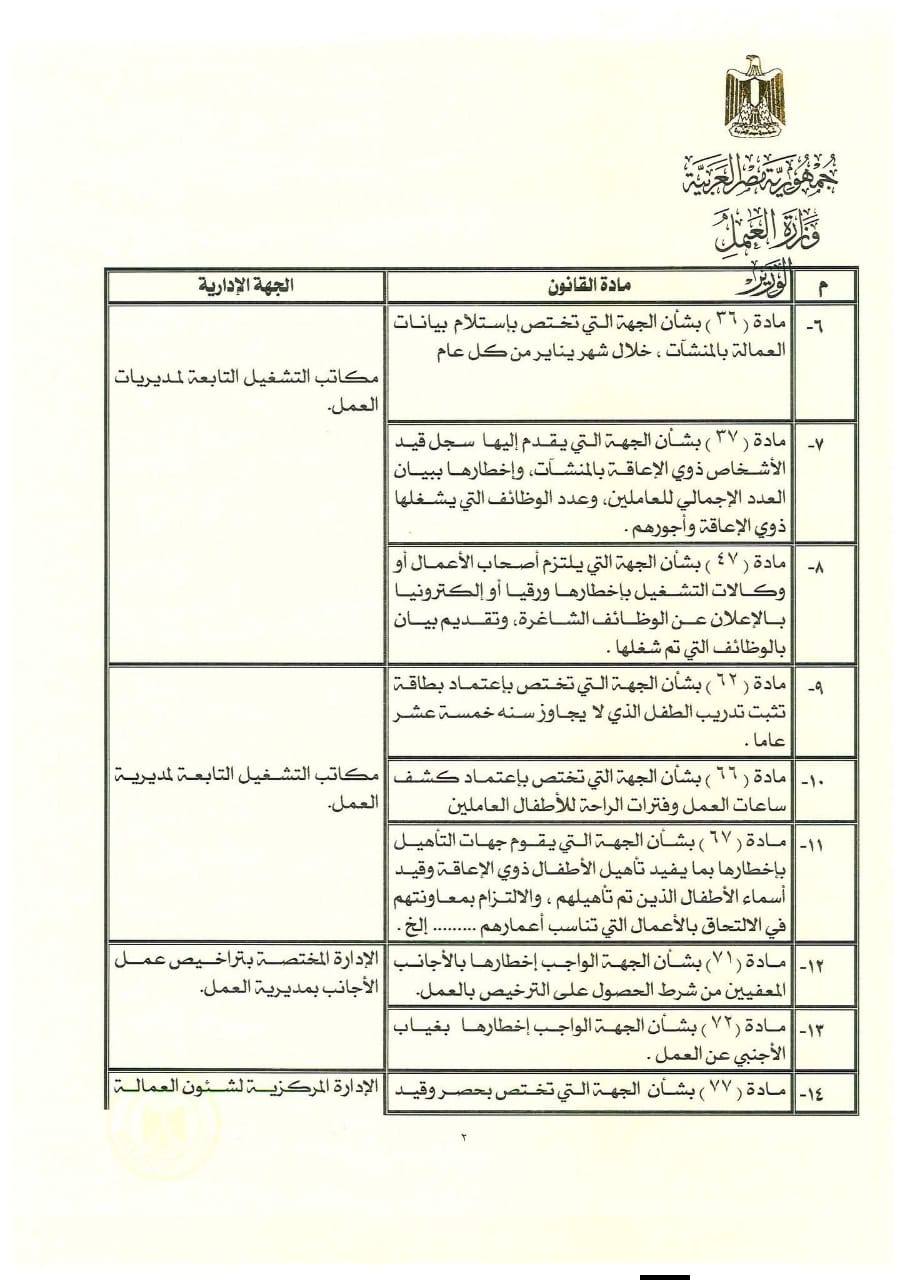 يُقصد بالجهة الإدارية المختصة في تطبيق أحكام قانون العمل المشار إليه، الجهات المبينة قرين كل مادة، على النحو التالي: