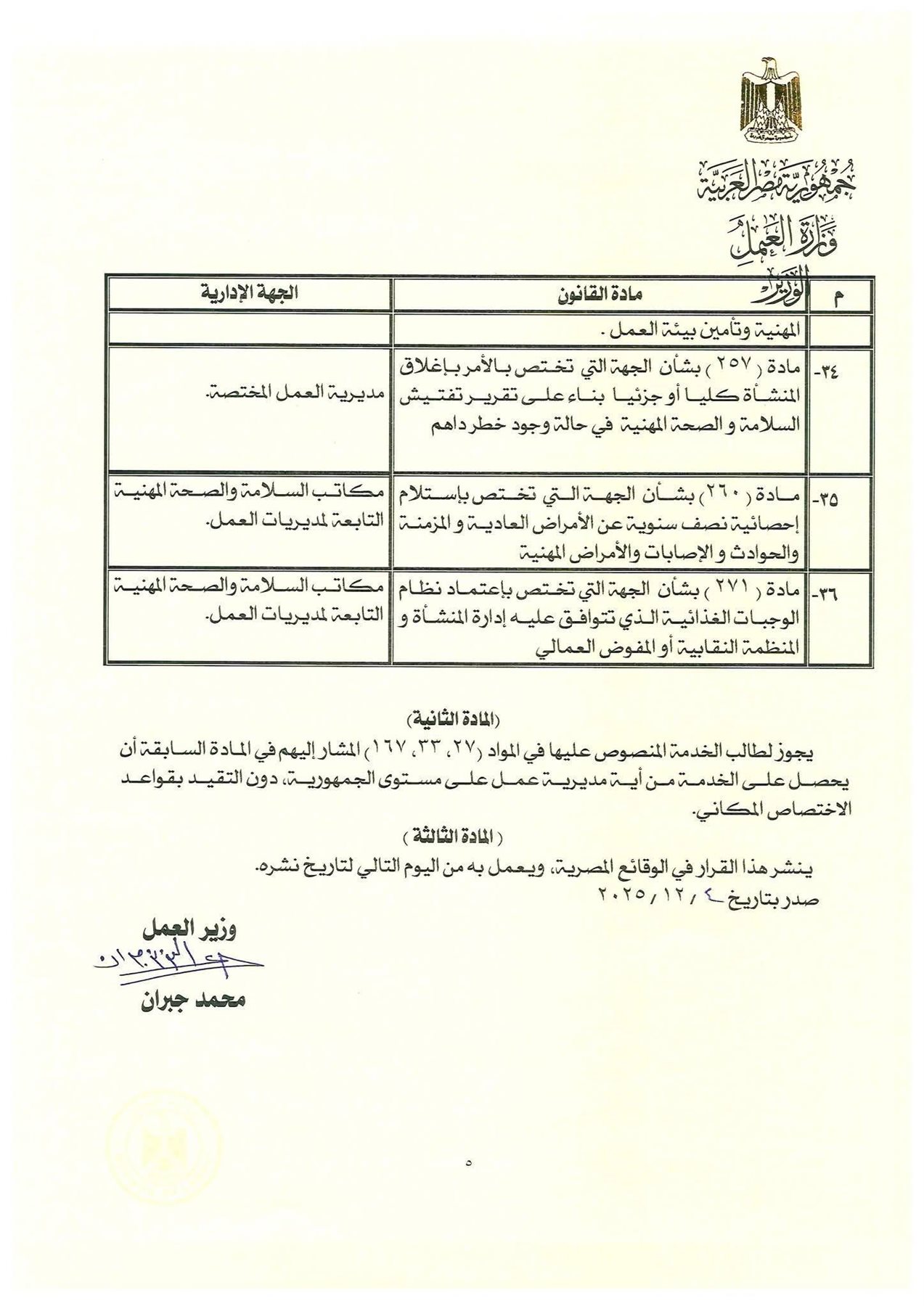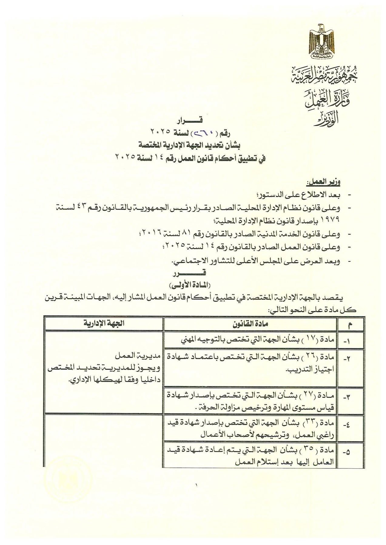 أصدر وزير العمل محمد جبران قرارًا وزاريًا رقم (260) لسنة 2025، بشأن تحديد الجهة الإدارية المختصة بتطبيق أحكام قانون العمل رقم 14 لسنة 2025، وذلك بعد الاطلاع على الدستور، وعلى قانون نظام الإدارة المحلية الصادر بالقانون رقم 43 لسنة 1979، وعلى قانون الخدمة المدنية الصادر بالقانون رقم 81 لسنة 2016، وعلى قانون العمل الصادر بالقانون رقم 14 لسنة 2025، وبعد العرض على المجلس الأعلى للتشاور الاجتماعي.