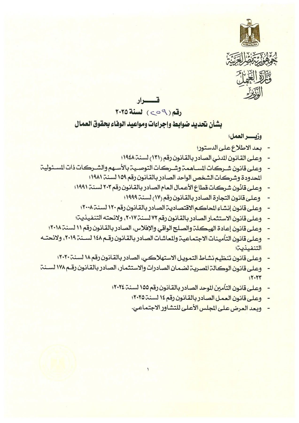 تفاصيل القرار الوزاري رقم (259) لسنة 2025 بشأن تحديد ضوابط وإجراءات ومواعيد الوفاء بحقوق العمال
