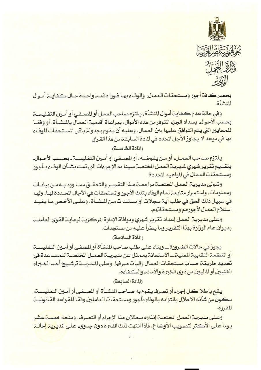 وأوضح وزير العمل أن القرار يضع إطارًا قانونيًا منضبطًا وواضحًا لمواعيد وآليات صرف الأجور والمستحقات، ويحدد مسؤوليات صاحب العمل أو المصفّي أو أمين التفليسة، مع إسناد دور رقابي وتنفيذي لمديريات العمل، بما يعزز من استقرار علاقات العمل ويحفظ التوازن بين أطراف العملية الإنتاجية...وفي هذا السياق، وجّه الوزير بنشر تفاصيل هذا القرار ضمن سلسلة نشر القرارات التنفيذية، لما له من أهمية خاصة لدى العاملين وأصحاب الأعمال، كونه يجيب على تساؤلات جوهرية تتعلق بحقوق العمال في حالات الإغلاق أو التصفية، وآليات تحصيل مستحقاتهم، والضمانات القانونية المكفولة لهم.