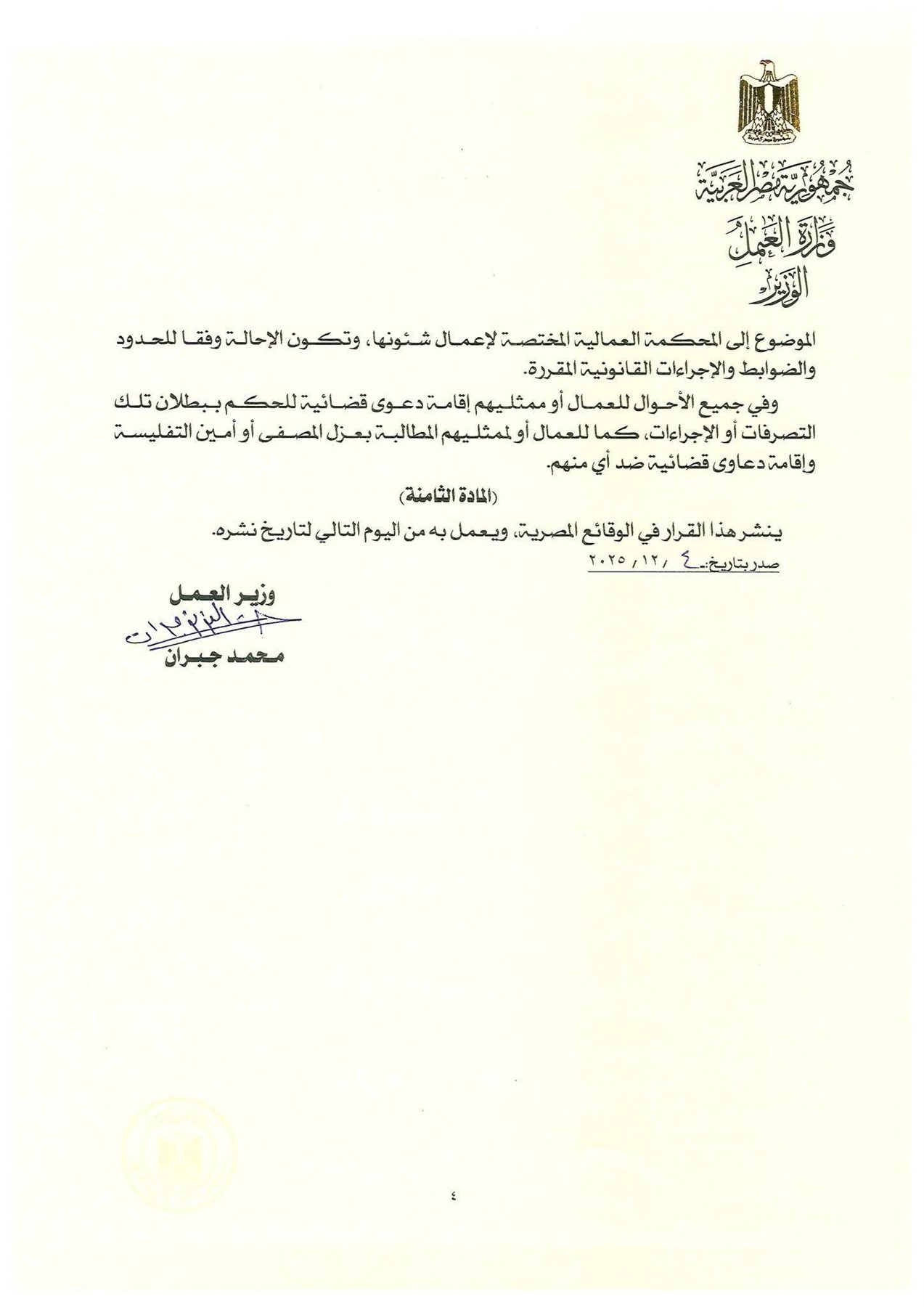 أصدر وزير العمل محمد جبران، قرارًا وزاريًا رقم (259) لسنة 2025، بشأن تحديد ضوابط وإجراءات ومواعيد الوفاء بحقوق العمال، وذلك بعد الاطلاع على الدستور، والقوانين المنظمة ذات الصلة، وعلى قانون العمل رقم 14 لسنة 2025، وبعد العرض على المجلس الأعلى للتشاور الاجتماعي.
