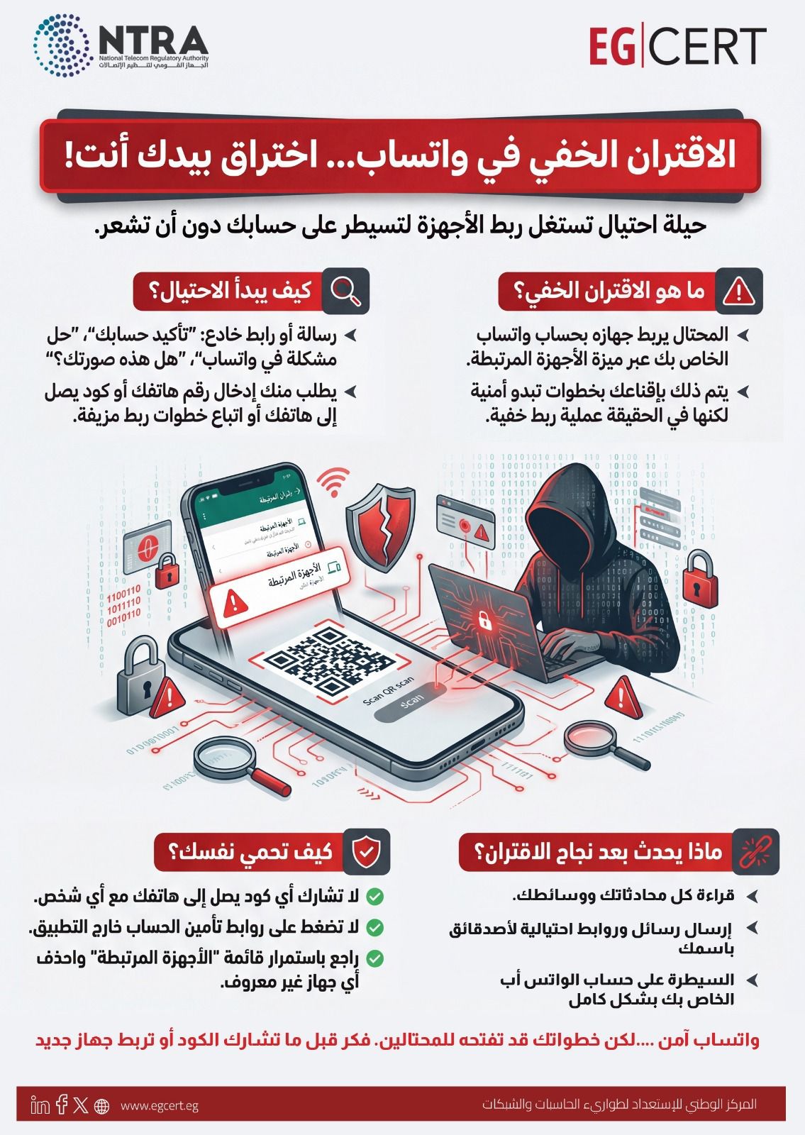أصدر المركز الوطني للاستعداد لطوارئ الحاسبات والشبكات (EG-CERT)، التابع للجهاز القومي لتنظيم الاتصالات، تحذيرًا أمنيًا عالي الأهمية لمستخدمي تطبيق «واتساب»، محذرًا من حيلة احتيالية جديدة تُعرف باسم «الاقتران الخفي»، تستغل ميزة ربط الأجهزة للسيطرة على حسابات المستخدمين دون علمهم.