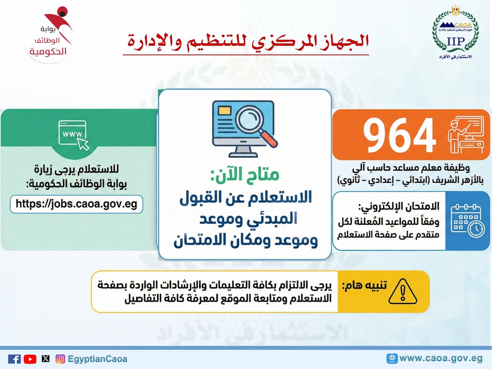 بوابة الوظائف الحكومية ، أعلن الجهاز المركزي للتنظيم والإدارة عن إتاحة الاستعلام عن نتيجة القبول المبدئي لـ وظائف معلم مساعد حاسب آلي بالأزهر الشريف لجميع المراحل الدراسية (ابتدائي، إعدادي، ثانوي) والتي تشمل 964 وظيفة.