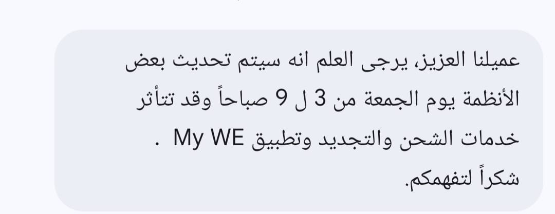 «عميلنا العزيز، يرجى العلم أنه سيتم تحديث بعض الأنظمة يوم الجمعة من 3 لـ 9 صباحاً وقد تتأثر خدمات الشحن والتجديد وتطبيق My WE».