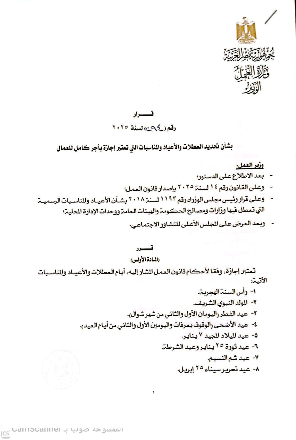 وأكد وزير العمل، أن القرار يأتي استنادًا إلى أحكام الدستور المصري، وقانون العمل الجديد رقم (14) لسنة 2025، وقرار رئيس مجلس الوزراء رقم (1194) لسنة 2018 بشأن الأعياد والمناسبات الرسمية، وبعد العرض على المجلس الأعلى للتشاور الاجتماعي، في إطار استكمال منظومة القرارات التنفيذية الهادفة إلى حماية حقوق العمال، وتحقيق العدالة الاجتماعية، وتوحيد القواعد المنظمة لإجازات العاملين بأجر كامل.