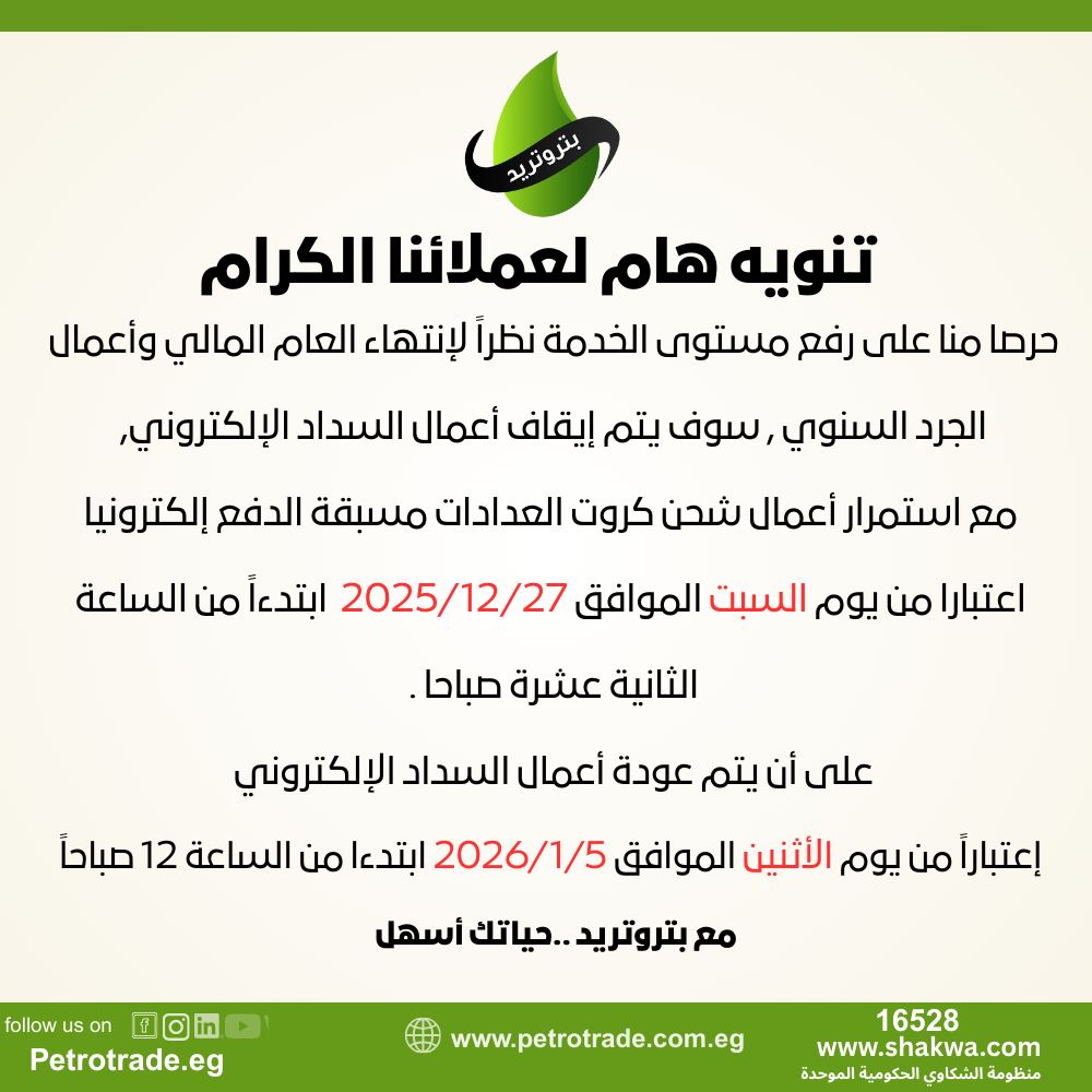 وأوضحت شركة بتروتريد، أنه سوف يتم إيقاف أعمال السداد الإلكتروني مع استمرار خدمة الشحن الإلكتروني للعدادات مسبقة الدفع، اعتبارًا من السبت الموافق 27/12/2025 الساعة 12 صباحًا، على أن يتم عودة أعمال السداد الإلكتروني اعتبارًا من الاثنين 5/01/2026 الساعة 12 صباحًا.