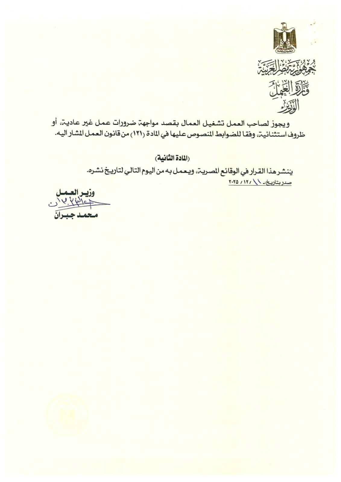 ويجوز لصاحب العمل تشغيل العمال بقصد مواجهة ضرورات عمل غير عادية أو ظروف استثنائية، وفقًا للضوابط المنصوص عليها في المادة (121) من قانون العمل المشار إليه.