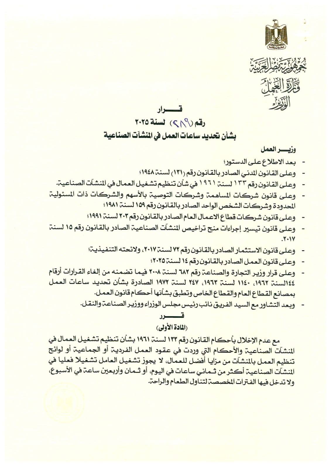 قرار رقم (289) لسنة 2025 بشأن تحديد ساعات العمل في المنشآت الصناعية، بعد الاطلاع على الدستور، وعلى القانون المدني الصادر بالقانون رقم (131) لسنة 1948؛ وعلى القانون رقم (133) لسنة 1961 في شأن تنظيم تشغيل العمال في المنشآت الصناعية؛ وعلى قانون شركات المساهمة وشركات التوصية بالأسهم والشركات ذات المسؤولية المحدودة وشركات الشخص الواحد الصادر بالقانون رقم (159) لسنة 1981، وعلى قانون شركات قطاع الأعمال العام الصادر بالقانون رقم (203) لسنة 1991؛ وعلى قانون تيسير إجراءات منح تراخيص المنشآت الصناعية الصادر بالقانون رقم (15) لسنة 2017، وعلى قانون الاستثمار الصادر بالقانون رقم (72) لسنة 2017 ولائحته التنفيذية؛ وعلى قانون العمل الصادر بالقانون رقم (14) لسنة 2025؛ وعلى قرار وزير التجارة والصناعة رقم (682) لسنة 2008 فيما تضمنه من إلغاء القرارات أرقام 144 لسنة 1962، و114 لسنة 1963، و140 لسنة 1963، و247 لسنة 1972 الصادرة بشأن تحديد ساعات العمل بمصانع القطاع العام والقطاع الخاص وتطبيق بشأنها أحكام قانون العمل؛ وبعد التشاور مع السيد الفريق نائب رئيس مجلس الوزراء ووزير الصناعة والنقل.