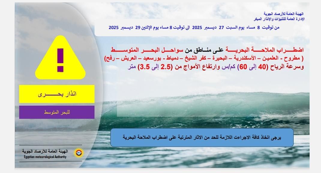ومن المتوقع اضطراب الملاحة البحرية بمناطق «العلمين - الإسكندرية - البحيرة - كفرالشيخ - دمياط - بورسعيد - العريش - رفح»، وسرعة الرياح من 40 إلى 60 كم/س، وارتفاع الأمواج من 2.5 إلى 3.5 متر.