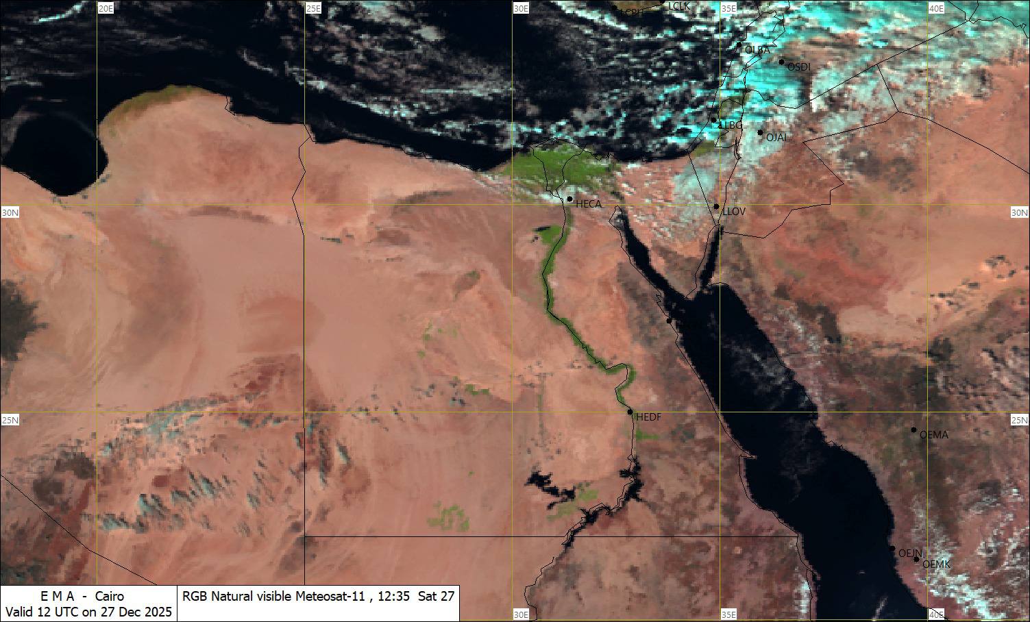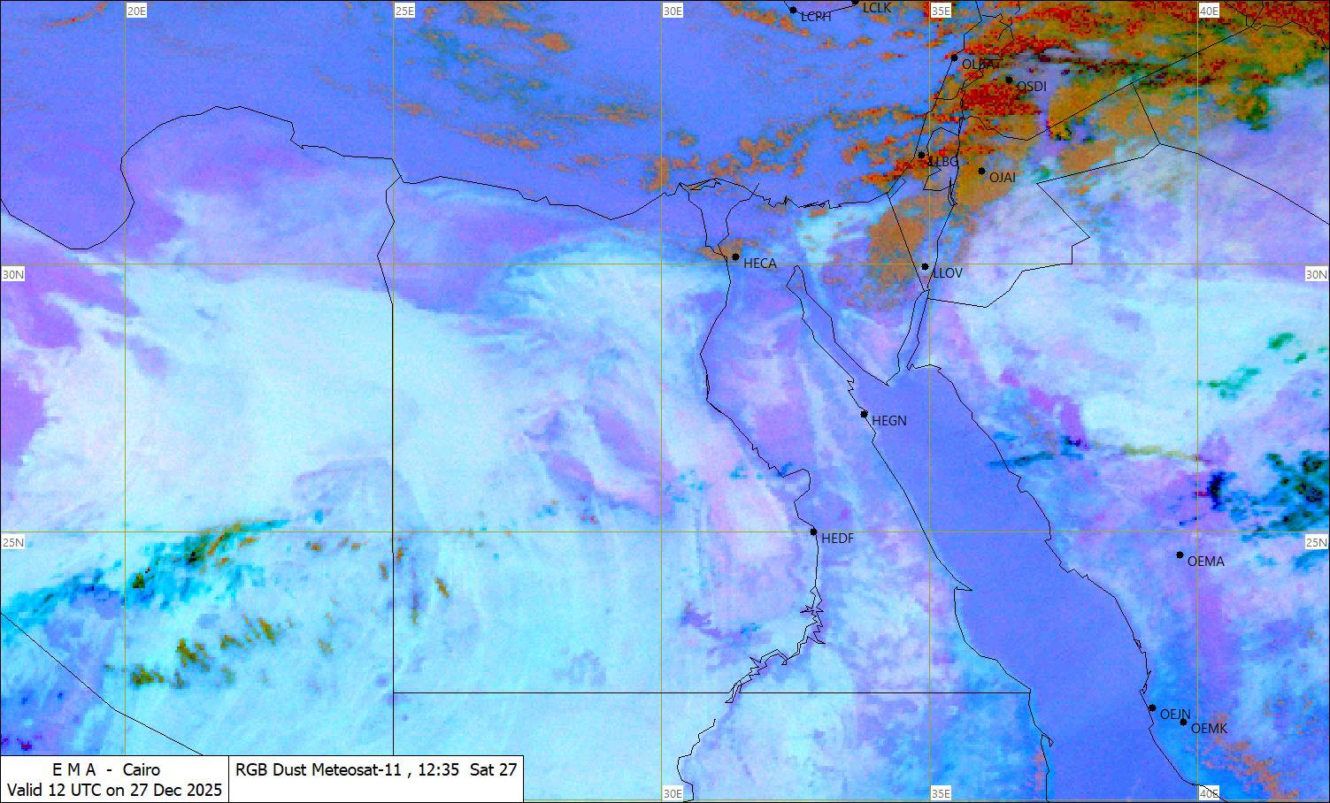وتظهر السحب المنخفضة والمتوسطة على مناطق متفرقة من جنوب الوجه البحري، وتتجه السحب إلى القاهرة الكبرى يصاحبها فرص سقوط أمطار خفيفة على مناطق متفرقة.