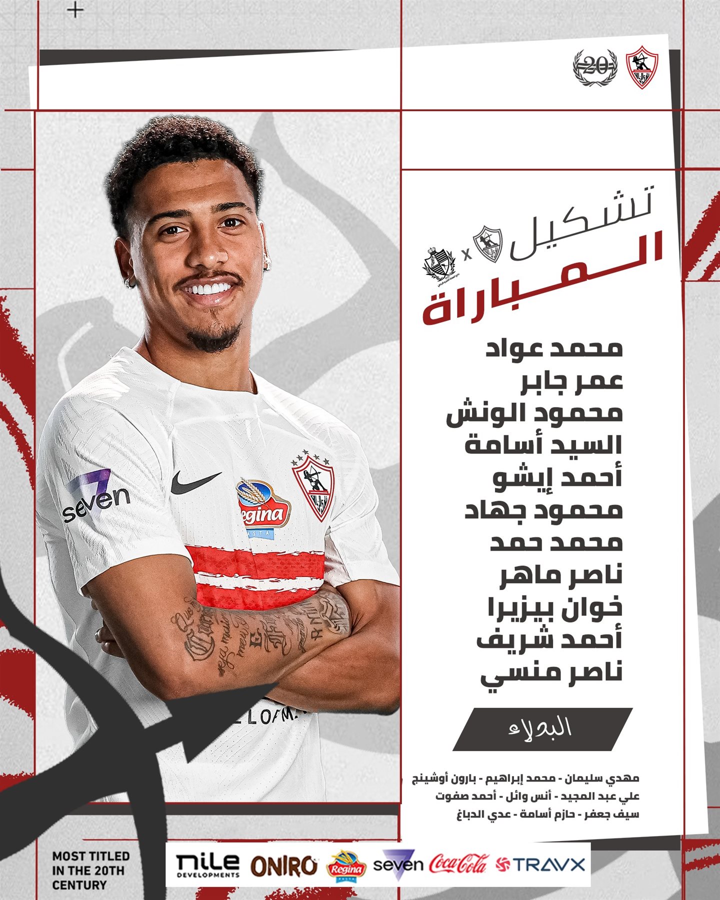 ويتواجد على مقاعد البدلاء، مهدي سليمان وعلي عبد المجيد وبارون أوشينج ومحمد إبراهيم وسيف جعفر وأحمد صفوت وأنس وائل وحازم أسامة وعدي الدباغ.