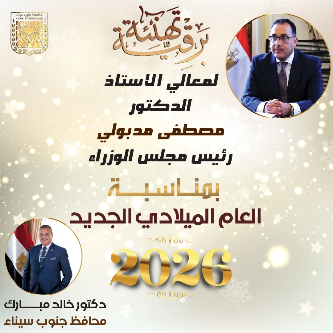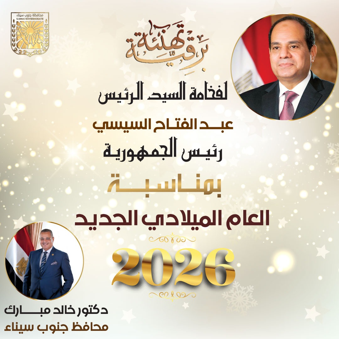 بعث محافظ جنوب سيناء الدكتور خالد مبارك برقية تهنئة إلى الرئيس عبدالفتاح السيسي، بمناسبة حلول العام الميلادي الجديد 2026.