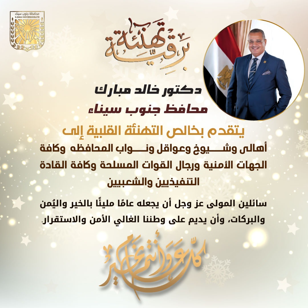 ونشر المحافظ، عبر صفحته الرسمية، تهنئة لأهالي وشيوخ وعواقل ونواب محافظة جنوب سيناء، وكافة الجهات الأمنية، ورجال القوات المسلحة، وجميع القيادات التنفيذية والشعبية، متمنيًا أن يكون العام الجديد عامًا مليئًا بالخير واليُمن والبركات، داعيًا المولى عز وجل أن يُديم على مصرنا الغالية نعمة الأمن والاستقرار، وأن يوفق الجميع لما فيه رفعة الوطن وتقدمه.