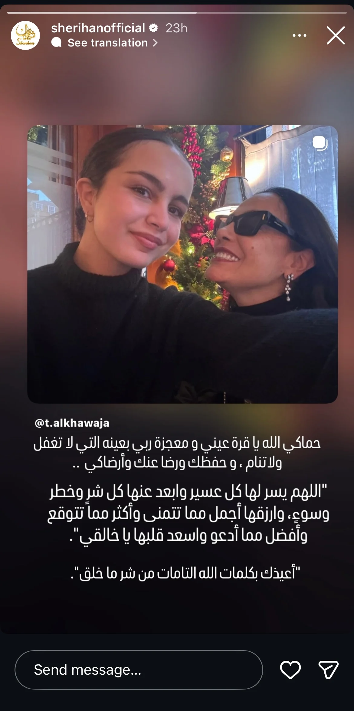 احتفلت النجمة شريهان ببداية العام الجديد 2026، حيث أعادت نشر منشور ابنتها على إنستجرام الذي تضمن صورًا تجمعهما، وهنأتها خلاله لتشارك الصور على الاستوري الخاص بها، وعلقت قائلة: "حماك الله يا قرة عيني ومعجزة ربي بعينه التي لا تغفل ولا تنام، وحفظك ورضي عنك وأرضاك".