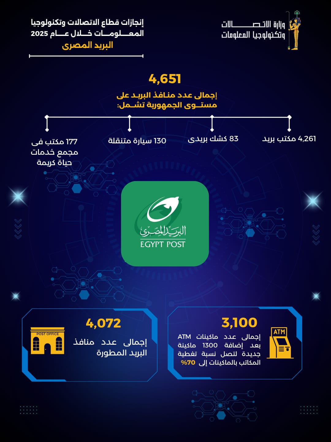 وتواصلت جهود تطوير البنية الأساسية لشبكات المحمول من خلال إنشاء محطات تغطية جديدة بخدمات المحمول بغرض إتاحة النفاذ واستيعاب الطلب المتنامي على خدمات الاتصالات للمواطنين بالمجتمعات الحضرية والمجتمعات الريفية والنائية، مما نتج عنه زيادة نسبة المناطق المأهولة المغطاة بخدمات الجيل الرابع من 90% إلى 92%، ليصبح إجمالي عدد المحطات 37003 محطة. وذلك بعد إضافة 2500 محطة محمول خلال عام 2025.