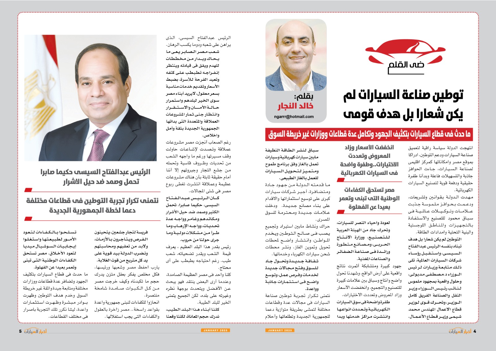 البداية مع مقال الكاتب الصحفي خالد النجار الذي جاء بعنوان "توطين صناعة السيارات لم يكن شعارًا بل هدف قومي"، حيث قال إن الدولة انتهجت سياسة راقية في تعميق صناعة السيارات ودعم التوطين، إدراكا بموقع مصر وإمكاناتها كمركز إقليمي لصناعة السيارات، حيث جاءت الحوافز جاذبة والتسهيلات فاعلة وبدأنا طفرة حقيقية ودفعة قوية لتصنيع السيارات الكهربائية.