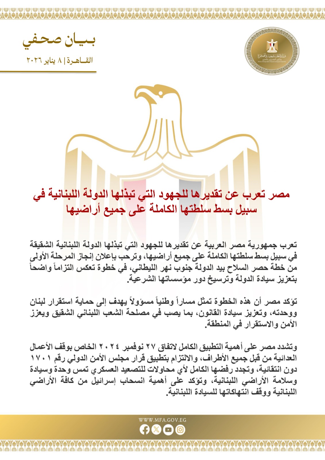 أعربت جمهورية مصر العربية عن تقديرها للجهود التي تبذلها الدولة اللبنانية الشقيقة في سبيل بسط سلطتها الكاملة على جميع أراضيها، وترحب بإعلان إنجاز المرحلة الأولى خطة حصر السلاح بيد الدولة جنوب نهر الليطاني، في خطوة تعكس التزاماً واضحاً بتعزيز سيادة الدولة وترسيخ دور مؤسساتها الشرعية.