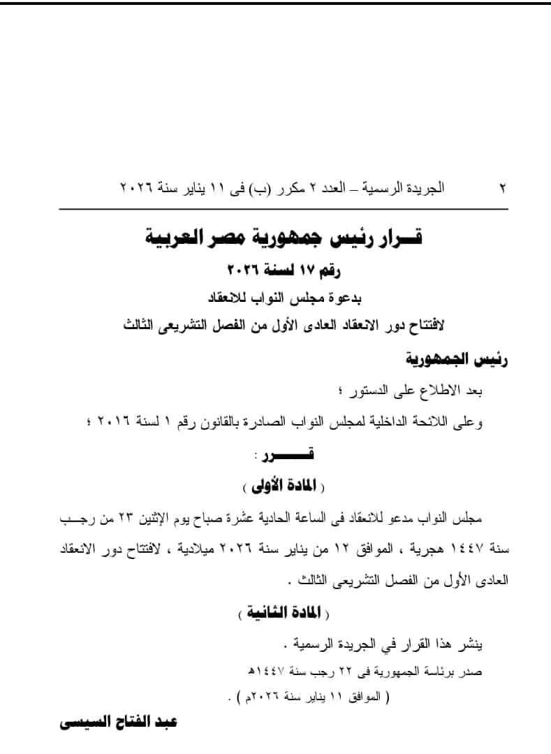 عاجل.. قرار جمهوري بدعوة مجلس النواب لافتتاح دور الانعقاد الأول من الفصل التشريعي الثالث غدًا