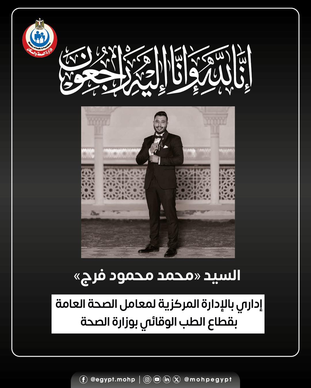 نعى الدكتور خالد عبدالغفار نائب رئيس مجلس الوزراء وزير الصحة والسكان، وجميع العاملين بالوزارة والجهات التابعة لها، ببالغ الحزن والأسى، «محمد محمود فرج» إداري بالإدارة المركزية لمعامل الصحة العامة بقطاع الطب الوقائي بوزارة الصحة، داعياً المولى عز وجل أن يتغمد الفقيد بواسع رحمته وأن يسكنه فسيح جناته، وأن يلهم ذويه الصبر والسلوان.