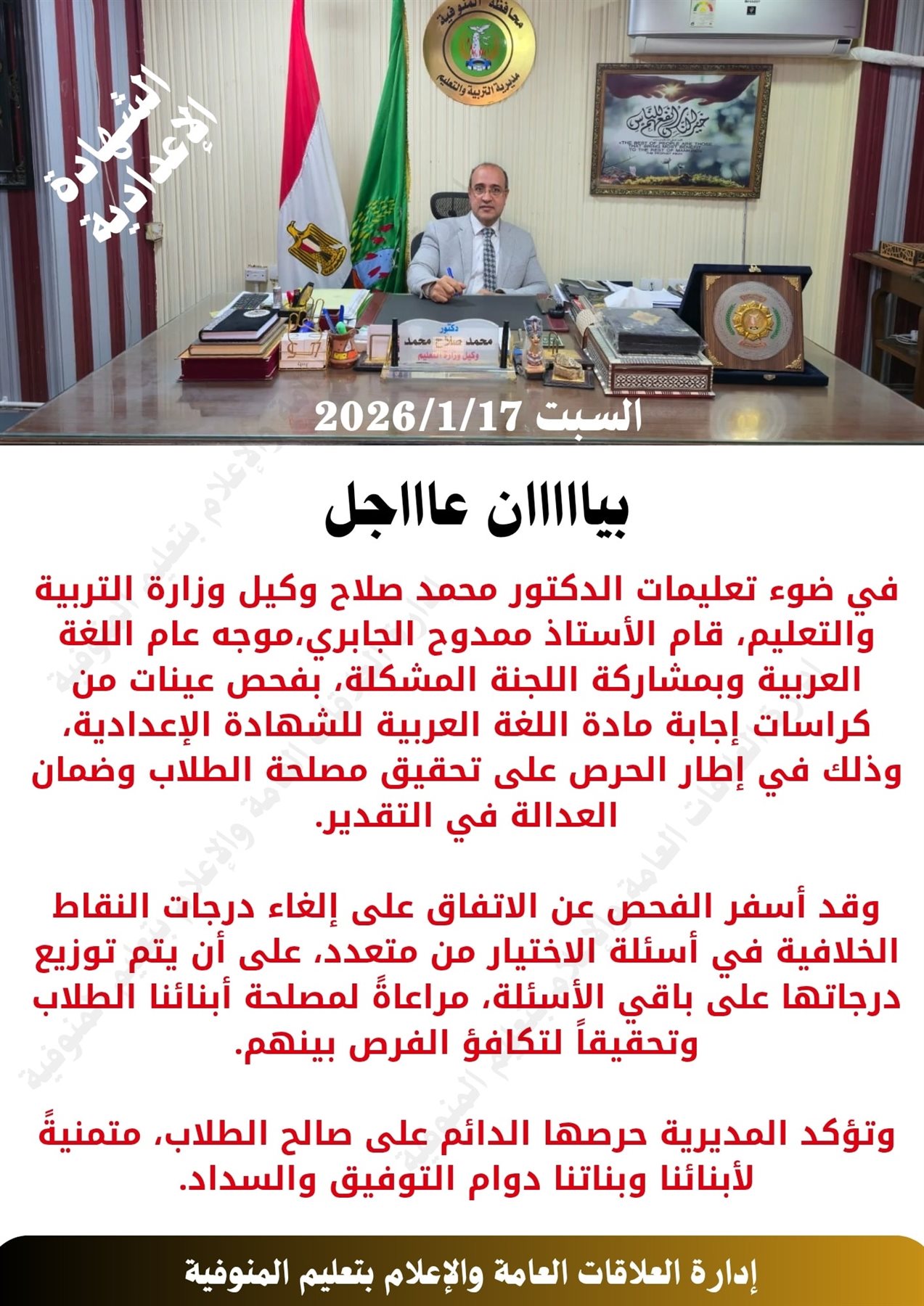 أعلنت مديرية التربية والتعليم بمحافظة المنوفية اتخاذ عدد من الإجراءات العاجلة بشأن امتحان اللغة العربية للشهادة الإعدادية، وذلك في إطار الحرص على مصلحة الطلاب وتحقيق العدالة في التقييم.