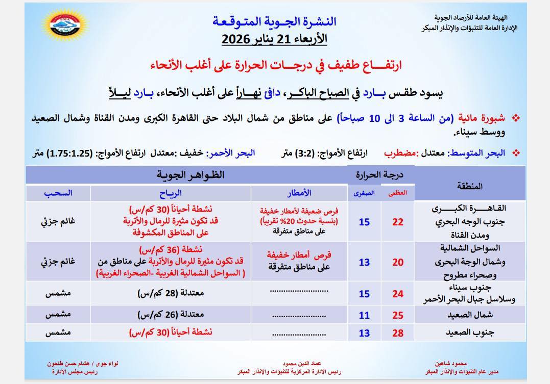 يتوقع خبراء هيئة الأرصاد الجوية أن يسود، غدا الأربعاء، طقس دافئ نهارا على أغلب أنحاء الجمهورية، بينما يكون باردا ليلا على معظم الأنحاء.