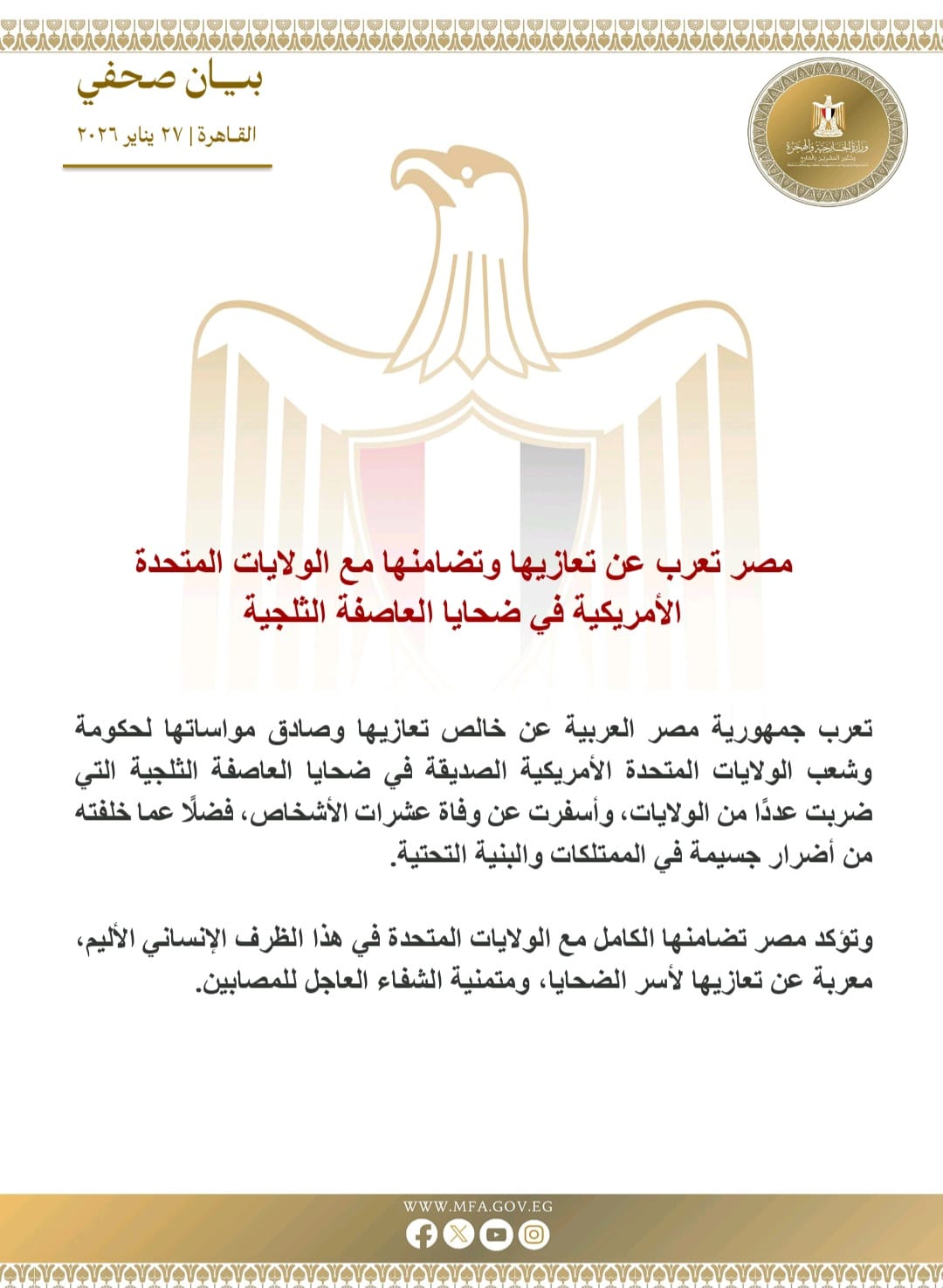 أعربت جمهورية مصر العربية عن خالص تعازيها وصادق مواساتها لحكومة وشعب الولايات المتحدة الأمريكية الصديقة في ضحايا العاصفة الثلجية التي ضربت عددًا من الولايات، وأسفرت عن وفاة عشرات الأشخاص، فضلًا عما خلفته من أضرار جسيمة في الممتلكات والبنية التحتية.