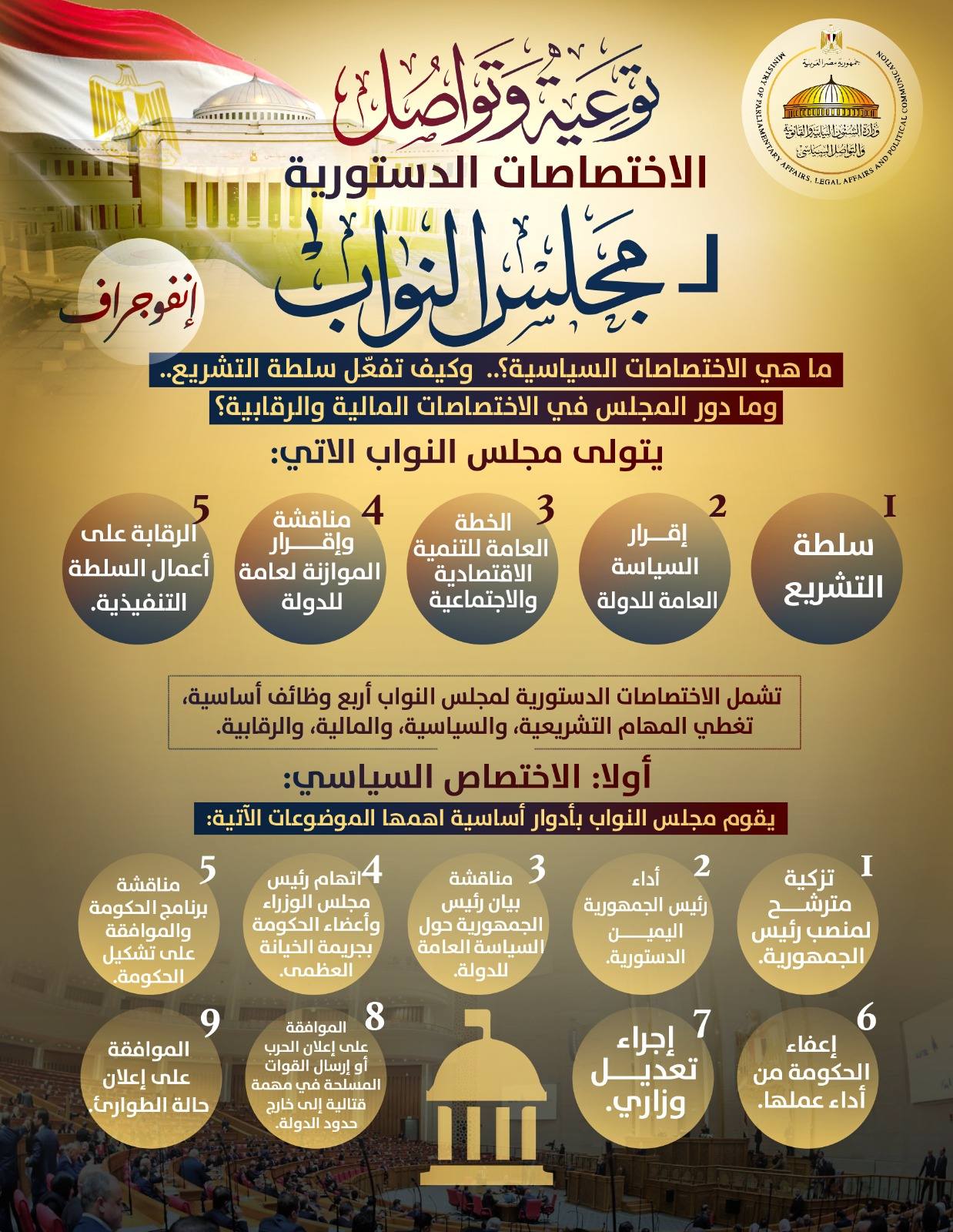 وفي سلسلة اليوم تقدم وزارة الشؤون النيابية والقانونية والتواصل السياسي معلومات عن كل ما يتعلق بالاختصاصات الدستورية لمجلس النواب والدور التشريعي والرقابي والمالي، والصلاحيات والمهام، في شكل إنفوجراف، حتى يتسنى للمواطن تحصيل المعلومة بسهولة ويسر.