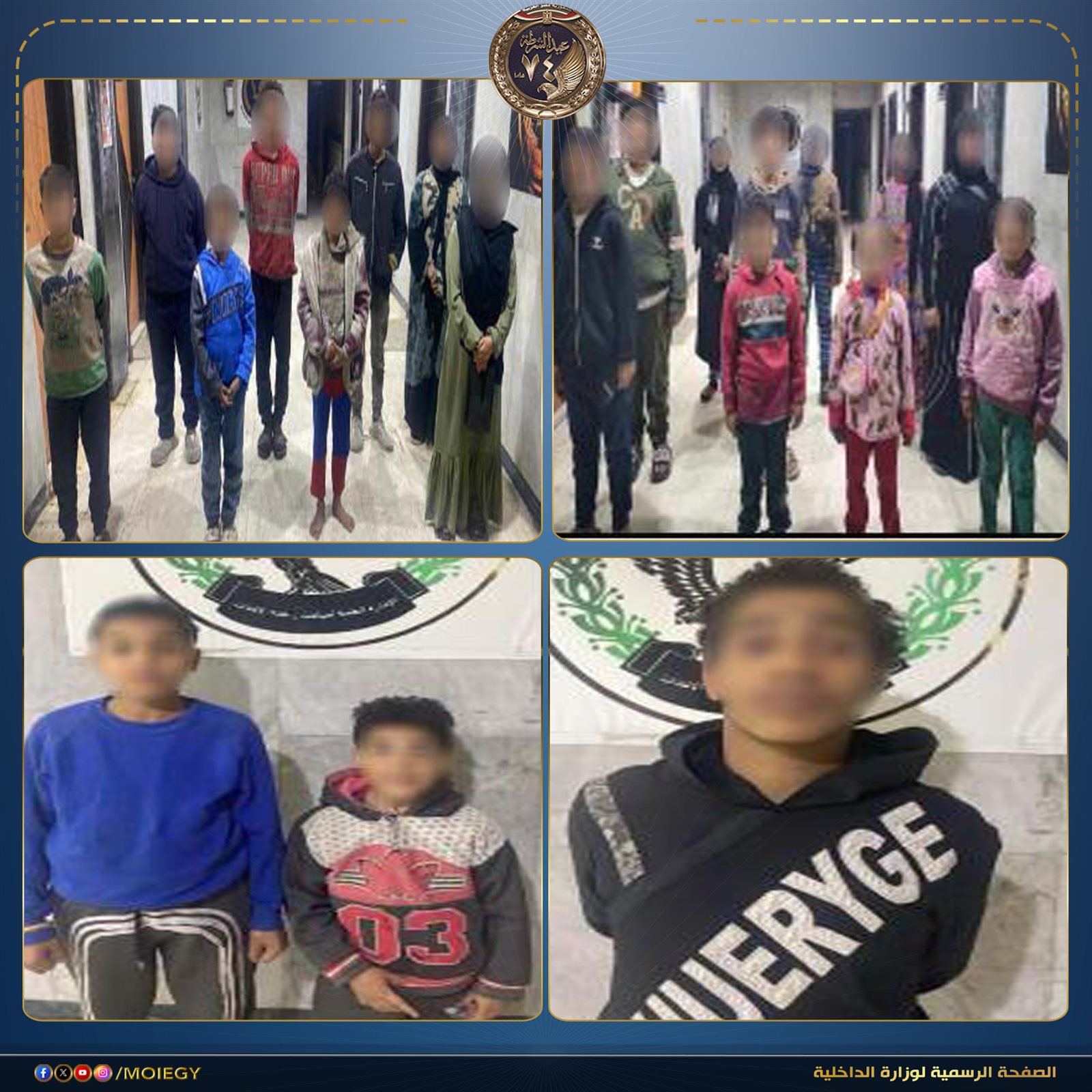 جاء ذلك استمراراً لجهود مكافحة جرائم استغلال الأحداث، حيث تمكنت الإدارة العامة لمباحث رعاية الأحداث بقطاع الشرطة المتخصصة من ضبط (8 رجال ، 5 سيدات – لـ 8 منهم معلومات جنائية) لقيامهم باستغلال الأطفال الأحداث فى أعمال التسول وإستجداء المارة وبيع السلع بطريقة إلحاحية بنطاق محافظتى "القاهرة – الجيزة" ، وبصحبتهم (25 حدثًا) من المعرضين للخطر حال قيامهم ببيع السلع بشكل إلحاحى والتسول وبمواجهتهم إعترفوا بنشاطهم الإجرامى.