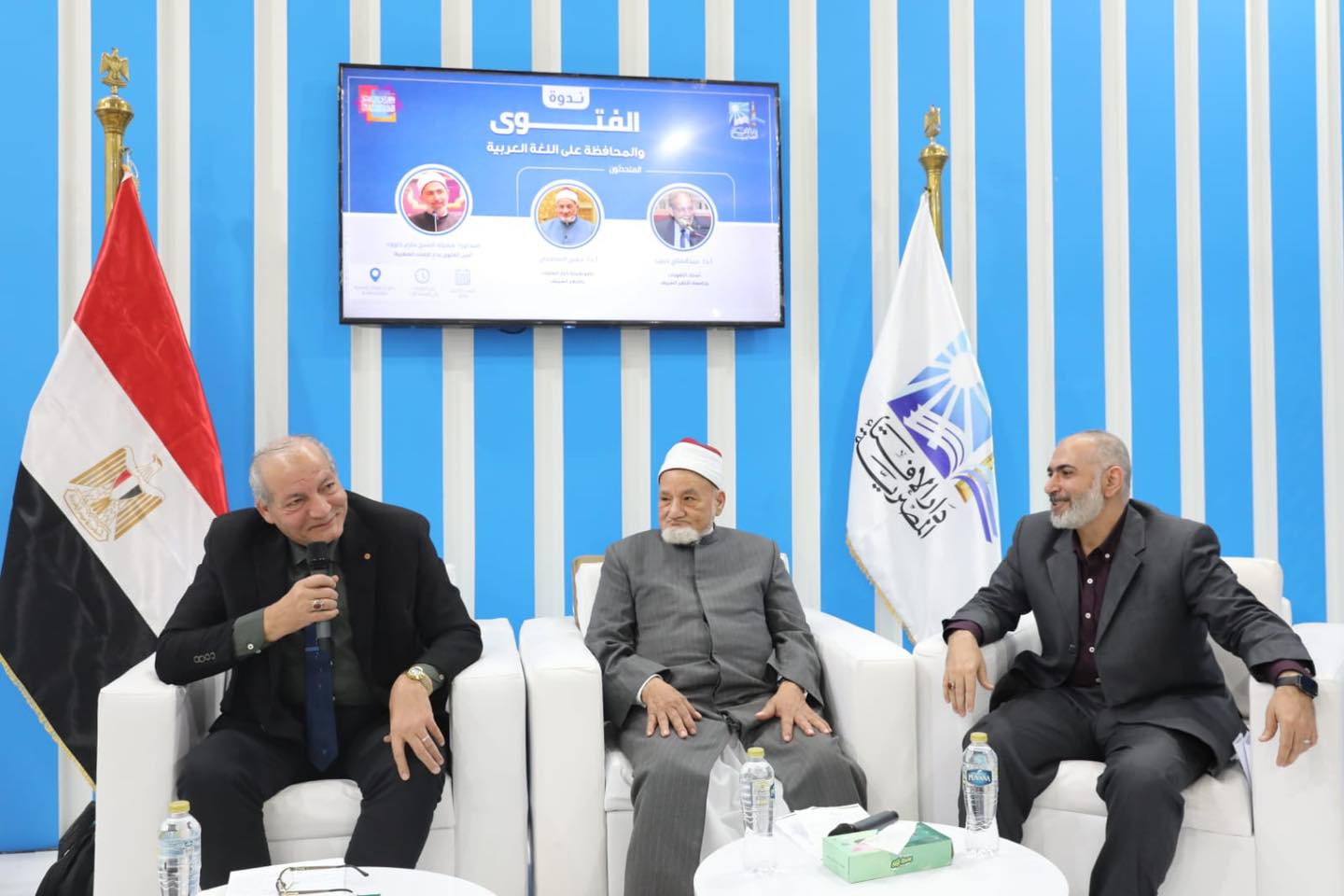 في إطار فعالياته الثقافية والفكرية بمعرض القاهرة الدولي للكتاب، نظَّم جناح دار الإفتاء المصرية ندوةً بعنوان: "الفتوى والمحافظة على اللغة العربية"، تناولت الدور المحوري للغة العربية في ضبط الخطاب الإفتائي وصيانة المعنى الشرعي وتعزيز التواصل الواعي بين المفتي والمجتمع. وقد استضافت الندوة كلًّا من الأستاذ الدكتور حسن الشافعي، عضو هيئة كبار العلماء بالأزهر الشريف، والدكتور عبد الفتاح حبيب، أستاذ اللغويات بجامعة الأزهر، فيما قدَّم الندوة وأدار مَحاورها فضيلة الشيخ حازم داود، أمين الفتوى بدار الإفتاء المصرية.